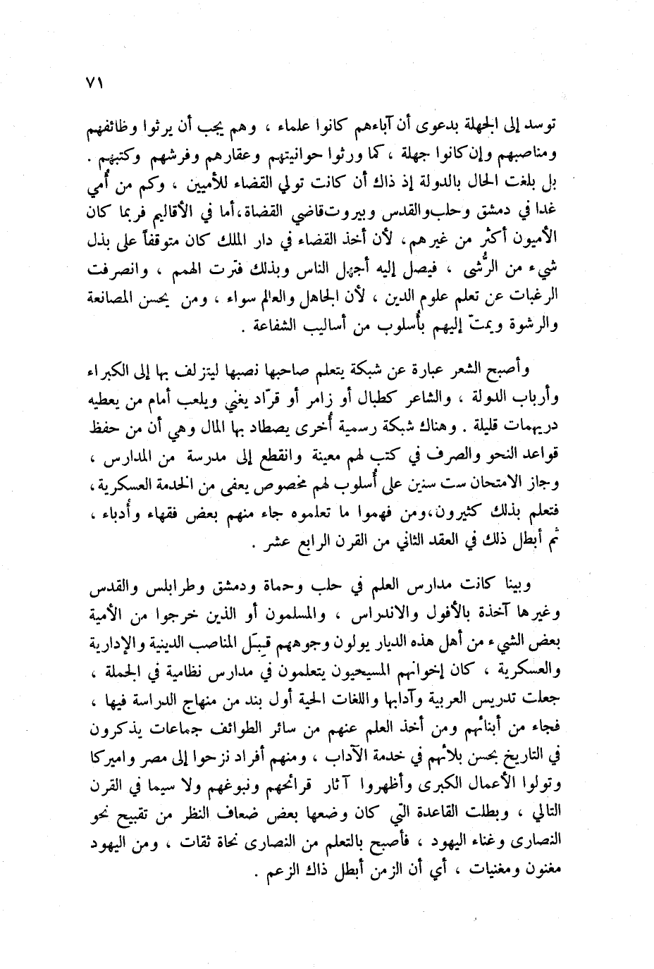 وبينا كانت مدارس العلم في حلب وحماة ودمشق وطرابلس والقدس وغيرها آخذة بالأفول والاندراس، والمسلمون أو الذين خرجوا من الأمية بعض الشيء من أهل هذه الديار يولون وجوههم قِبَل المناصب الدينية والإدارية والعسكرية، كان إخوانهم المسيحيون يتعلمون في مدارس نظامية في الجملة، جعلت تدريس العربية وآدابها واللغات الحية أول بند من منهاج الدراسة فيها، فجاء من أبنائهم ومن أخذ العلم عنهم من سائر الطوائف جماعات يذكرون في التاريخ بحسن بلائهم في خدمة الآداب، ومنهم أفراد نزحوا إلى مصر وأميركا وتولوا الأعمال الكبرى وأظهروا آثار قرائحهم ونبوغهم ولا سيما في القرن التالي، وبطلت القاعدة التي كان وضعها بعض ضعاف النظر من تقبيح نحو النصارى وغناء اليهود، فأصبح بالتعلم من النصارى نحاة ثقات، ومن اليهود مغنون ومغنيات، أي أن الزمن أبطل ذاك الزعم.