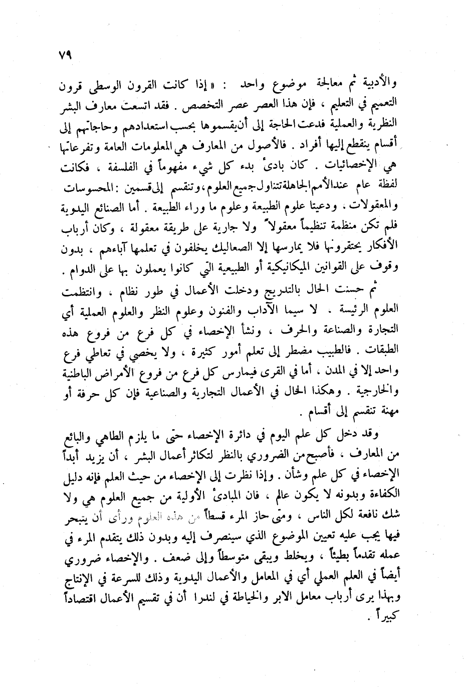 والأدبية ثم معالجة موضوع واحد: إذا كانت القرون الوسطى قرون التعميم في التعليم، فإن هذا العصر عصر التخصص. فقد اتسعت معارف البشر النظرية والعملية فدعت الحاجة إلى أن يقسموها بحسب استعدادهم وحاجاتهم إلى أقسام ينقطع إليها أفراد. فالأصول من المعارف هي المعلومات العامة وتفرعاتها هي الإخصائيات. كان بادئ بدء كل شيء مفهوماً في الفلسفة، فكانت لفظة عام عند الأمم الجاهلة تتناول جميع العلوم، وتنقسم إلى قسمين: المحسوسات والمعقولات، ودعيتا علوم الطبيعة وعلوم ما وراء الطبيعة. أما الصنائع اليدوية فلم تكن منظمة تنظيماً معقولاً ولا جارية على طريقة معقولة، وكان أرباب الأفكار يحتقرونها فلا يمارسها إلا الصعاليك يخلفون في تعلمها آباءهم، بدون وقوف على القوانين الميكانيكية أو الطبيعية التي كان يعملون بها على الدوام.