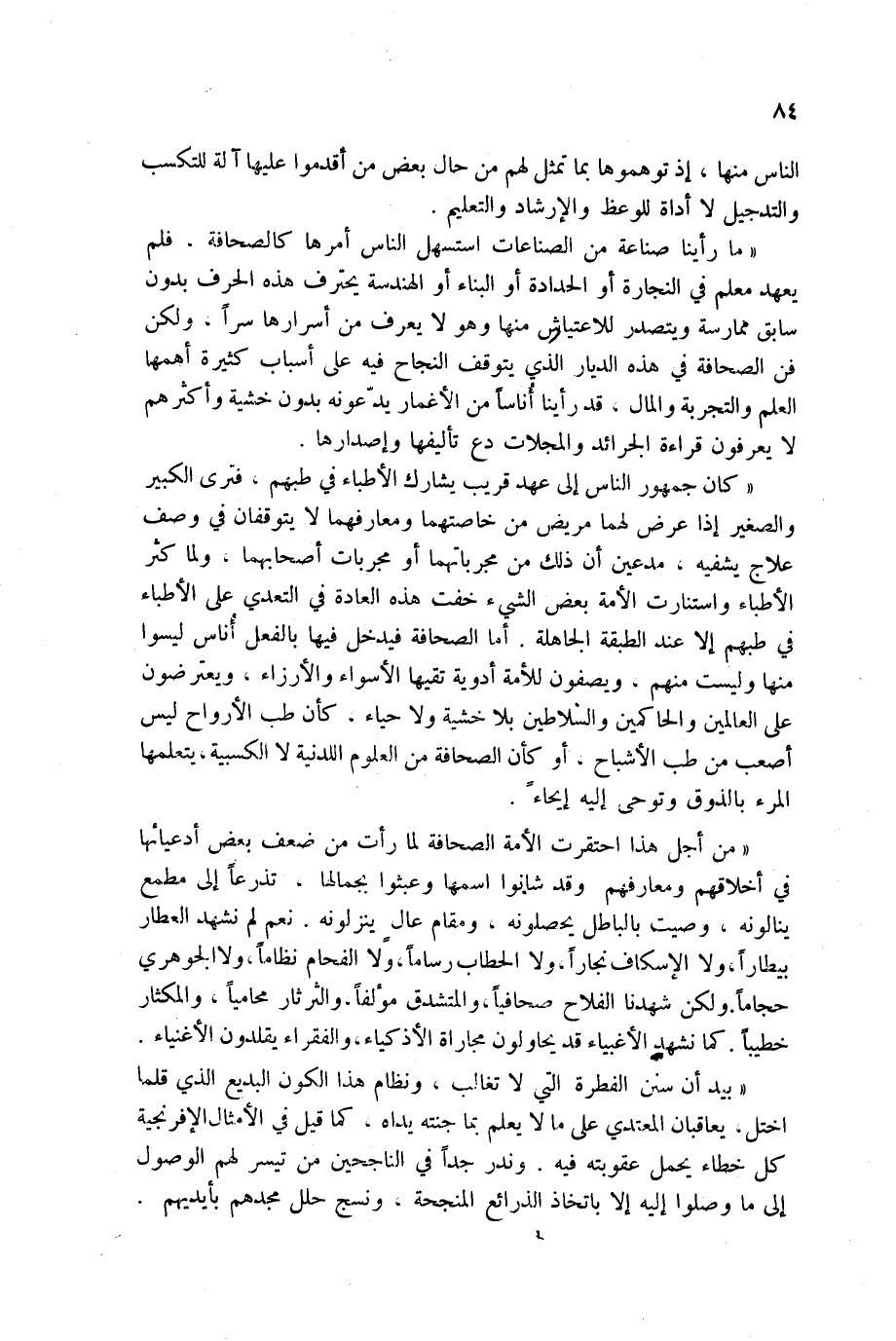 كان جمهور الناس إلى عهد قريب يشارك الأطباء في طبهم، فترى الكبير والصغير إذا عرض لهما مريض من خاصتهما ومعارفهما لا يتوقفان في وصف علاج يشفيه، مدعين أن ذلك من مجرباتهما أو مجربات أصحابهما، ولما كثر الأطباء واستنارت الأمة بعض الشيء خفت هذه العادة في التعدي على الأطباء في طبهم إلا عند الطبقة الجاهلة. أما الصحافة فيدخل فيها بالفعل أُناس ليسوا منها وليست منهم، ويصفون للأمة أدوية تقيها الأسواء والأرزاء، ويعترضون على العالمين والحاكمين والسلاطين بلا خشية ولا حياء، كأن طب الأرواح ليس أصعب من طب الأشباح، أو كأن الصحافة من العلوم اللدنية لا الكسبية، يتعلمها المرء بالذوق وتوحي إليه إيحاءً.
