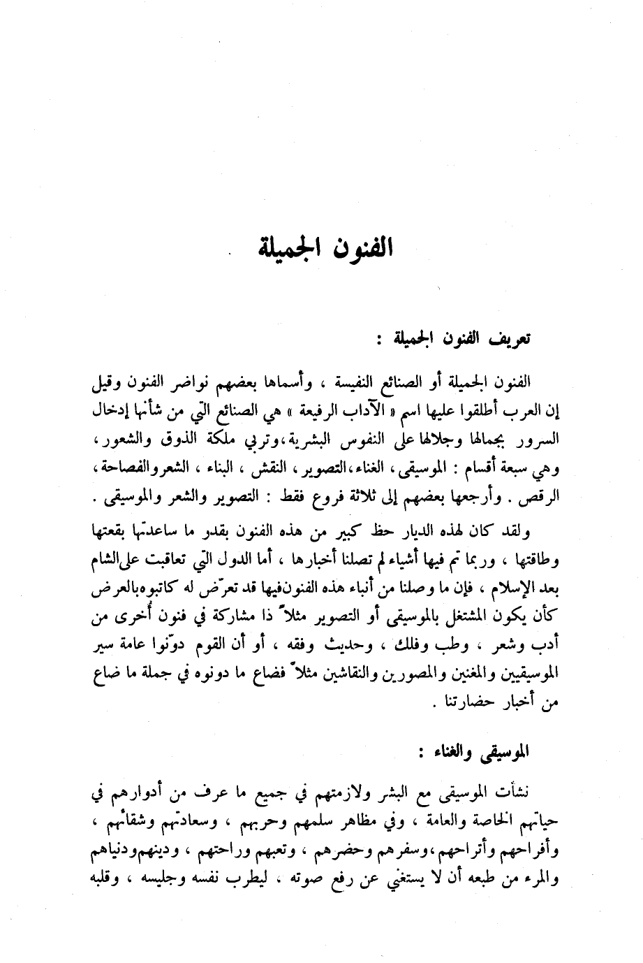 الفنون الجميلة أو الصنائع النفيسة، وأسماها بعضهم نواضر الفنون وقيل إن العرب أطلقوا عليها اسم الآداب الرفيعة هي الصنائع التي من شأنها إدخال السرور بجمالها وجلالها على النفوس البشرية، وتربي ملكة الذوق والشعور، وهي سبعة أقسام: الموسيقى، الغناء، التصوير، النقش، البناء، الشعر والفصاحة، الرقص. وأرجعها بعضهم إلى ثلاثة فروع فقط: التصوير والشعر والموسيقى. ولقد كان لهذه الديار حظ كبير من هذه الفنون بقدر ما ساعدتها بقعتها وطاقتها، وربما تم فيها أشياء لم تصلنا أخبارها، أما الدول التي تعاقبت على الشام بعد الإسلام، فإن ما وصلنا من أنباء هذه الفنون فيها قد تعرّض له كاتبوه بالعرض كأن يكون المشتغل بالموسيقى أو التصوير مثلاً ذا مشاركة في فنون أُخرى من أدب وشعر، وطب وفلك، وحديث وفقه، أو أن القوم دوّنوا عامة سير الموسيقيين والمغنين والمصورين والنقاشين مثلاً فضاع ما دونوه في جملة ما ضاع من أخبار حضارتنا.