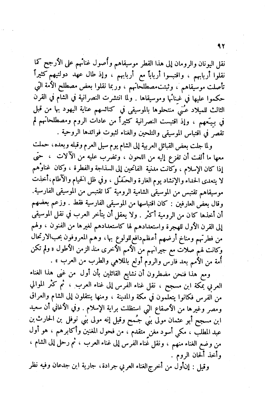 ومع هذا فنحن مضطرون أن نشايع القائلين بأن أول من غنى هذا الغناء العربي بمكة ابن مسجح، نقل غناء الفرس إلى غناء العرب. ثم كثر الموالي من الفرس فكانوا يتعلمون في مكة والمدينة، ومنها ينتقلون إلى الشام والعراق ومصر وغيرها