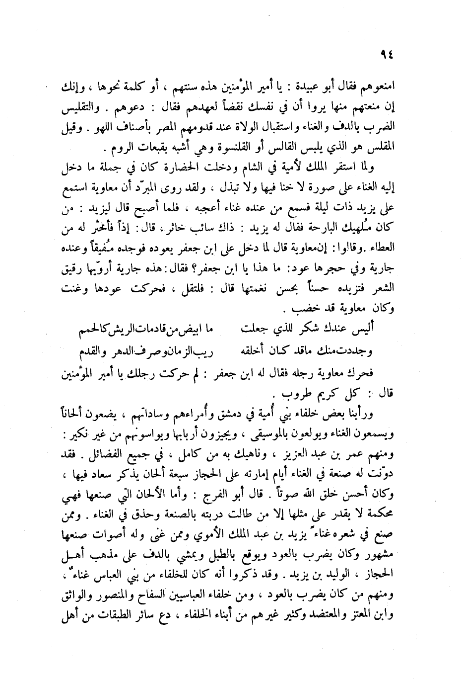 ورأينا بعض خلفاء بني أُمية في دمشق وأُمراءهم وساداتهم، يضعون ألحاناً ويسمعون الغناء ويولعون بالموسيقى، ويجيزون أربابهم ويواسونهم من غير نكير: ومنهم عمر بن عبد العزيز، وناهيك به من كامل، في جميع الفضائل. فقد دوّنت له صنعة في الغناء أيام إمارته على الحجاز سبعة ألحان يذكر سعاد فيها، وكان أحسن خلق الله صوتاً. قال أبو الفرج: وأما الألحان التي صنعها فهي محكمة لا يقدر على مثلها إلا من طالت دربته بالصنعة وحذق في الغناء. وممن صنع في شعره غناءً يزيد بن عبد الملك الأموي وممن غنى وله أصوات صنعها مشهور وكان يضرب بالعود ويوقع بالطبل ويمشي بالدف على مذهب أهل الحجاز، الوليد بن يزيد. وقد ذكروا أنه كان للخلفاء من بني العباس غناء، ومنهم من كان يضرب بالعود، ومن خلفاء العباسيين السفاح والمنصور والواثق وابن المعتز والمعتضد وكثير غيرهم من أبناء الخلفاء، دع سائر الطبقات من أهل