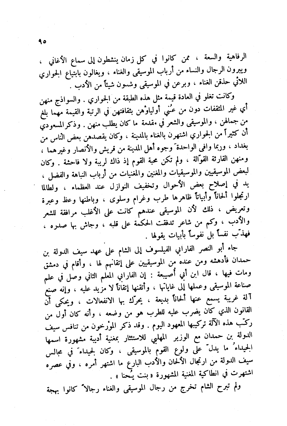 الرفاهية والسعة، ممن كانوا في كل زمان ينشطون إلى سماع الأغاني، ويبرون الرجال والنساء من أرباب الموسيقى والغناء، ويغالون بابتياع الجواري اللائي حذقن الغناء، وبرعن في الموسيقى وشدون شيئاً من الأدب.