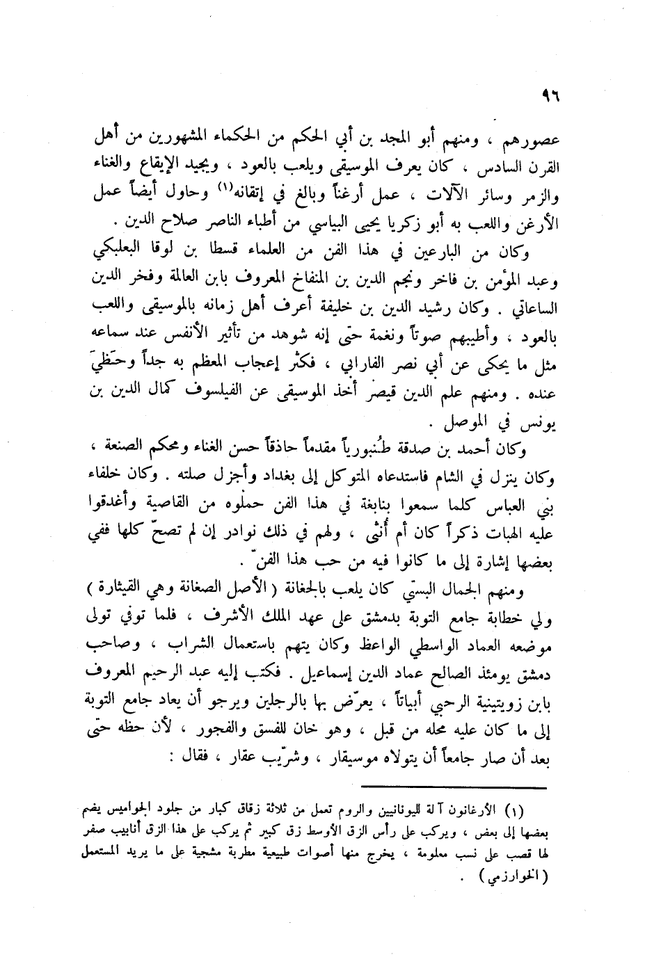 عصورهم، ومنهم أبو المجد بن أبي الحكم من الحكماء المشهورين من أهل القرن السادس، كان يعرف الموسيقى ويلعب بالعود، ويجيد الإيقاع والغناء والزمر وسائر الآلات، عمل أرغناً وبالغ في إتقانه (1) وحاول أيضاً عمل الأرغن واللعب به أبو زكريا يحيى البياسي من أطباء الناصر صلاح الدين.
