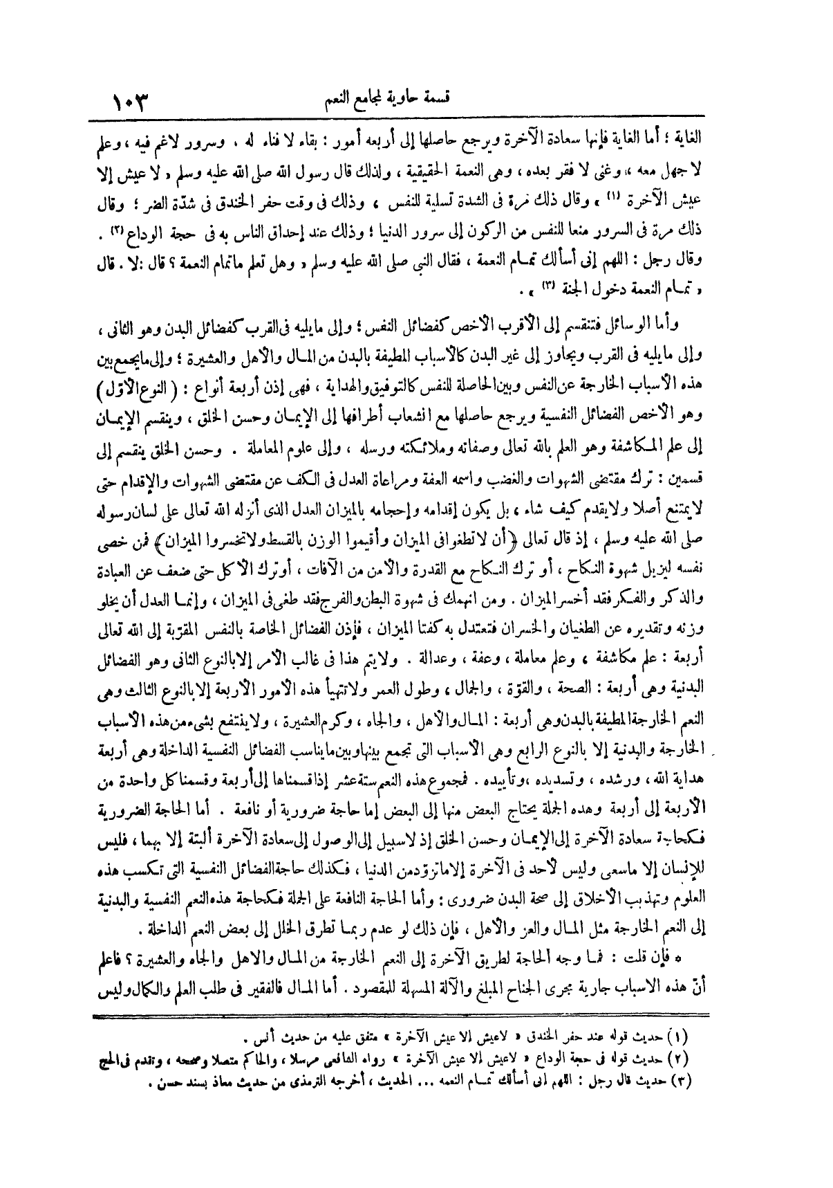 الغاية أم الغاية فإنها سعادة الآخرة ويرجع حاصلها إلى أربعة أمور بقاء لا فناء له وسرور لا غم فيه وعلم لا جهل معه وغنى لا فقر بعده وهي النعمة الحقيقية وَلِذَلِكَ قَالَ رَسُولُ اللَّهِ صَلَّى اللَّهُ عَلَيْهِ وسلم لا عيش إلا عيش الآخرة (¬1) وقال ذلك في الشدة تسلية النفس وذلك في وقت حفر الخندق في شدة الضر وقال ذلك مرة في السرور منعاً للنفس من الركون إلى سرور الدنيا وذلك عند إحداق الناس به في حجة الوداع حديث قوله في حجة الوداع لا عيش إلا عيشة الآخرة رواه الشافعي مرسلا والحاكم متصلا وصححه وتقدم في الحج وقال رجل اللهم إني أسألك تمام النعمة فقال النبي صلى الله عليه وسلم وهل تعلم ما تمام النعمة قال لا قال تمام النعمة دخول الجنة حديث قال رجل اللهم إني أسألك تمام النعمة الحديث (¬2) أما الوسائل فتنقسم إلى الأقرب الأخص كفضائل النفس وإلى ما يليه في القرب كفضائل البدن وهو الثاني وإلى ما يليه في القرب ويجاوز إلى غير البدن كالأسباب المطيفة بالبدن من المال والأهل والعشيرة وإلى ما يجمع بين هذه الأسباب الخارجة عن النفس وبين الحاصلة للنفس كالتوفيق والهداية فهي إذن أربعة أنواع النوع الأول وهو الأخص الفضائل النفسية ويرجع حاصلها مع انشعاب أطرافها إلى الإيمان وحسن الخلق وينقسم الإيمان إلى علم المكاشفة وهو العلم بالله تعالى وصفاته وملائكته ورسله وإلى علوم المعاملة وحسن الخلق ينقسم إلى قسمين ترك مقتضى الشهوات والغضب واسمه العفة ومراعاة العدل في الكف عن مقتضى الشهوات والإقدام حتى لا يمتنع أصلاً ولا يقدم كيف شاء بل يكون إقدامه وإحجامه بالميزان العدل الذي أنزله الله تعالى على لسان رسوله صلى الله عليه وسلم إذ قال الله تعالى إن لا تطغوا في الميزان وأقيموا الوزن بالقسط ولا تخسروا الميزان فمن خصي نفسه ليزيل شهوة النكاح أو ترك النكاح مع القدرة والأمن من الآفات أو ترك الأكل حتى ضعف عن العبادة والذكر والفكر فقد أخسر الميزان ومن انهمك في شهوة البطن والفرج فقد طغى في الميزان وإنما العدل أن يخلو وزنه وتقديره عن الطغيان والخسران فتعتدل به كفتا الميزان فإذن الفضائل الخاصة بالنفس المقربة إلى الله تعالى أربعة علم مكاشفة وعلم معاملة وعفة وعدالة ولا يتم هذا في غالب الأمر إلا بالنوع الثاني وهو الفضائل البدنية وهي أربعة الصحة والقوة والجمال وطول العمر ولا تتهيأ هذه الأمور الأربعة إلا بالنوع الثالث وهي النعم الخارجة المطيفة بالبدن وهي أربعة المال والأهل والجاه وكرم العشيرة ولا ينتفع بشيء من هذه الأسباب الخارجة والبدنية إلا بالنوع الرابع وهي الأسباب التي تجمع بينها وبين ما يناسب الفضائل النفسية الداخلة وهي أربعة هداية الله ورشده وتسديده وتأييده فمجموع هذه النعم ستة عشر إذا قسمناها إلى أربعة وقسمنا كل واحدة من الأربعة إلى أربعة وهذه الجملة يحتاج البعض منها إلى البعض إما حاجة ضرورية أو نافعة أم الحاجة الضرورية فكحاجة سعادة الآخرة إلى الإيمان وحسن الخلق إذ لا سبيل إلى الوصول إلى سعادة الآخرة البتة إلا بهما فليس للإنسان إلا ما سعى وليس لأحد في الآخرة إلا ما تزود من الدنيا فكذلك حاجة الفضائل النفسية التي تكسب هذه العلوم وتهذب الأخلاق إلى صحة البدن ضروري وأما الحاجة النافعة على الجملة فكحاجة هذه النعم النفسية والبدنية إلى النعم الخارجة مثل المال والعز والأهل فإن ذلك لو عدم ربما تطرق الخلل إلى بعض النعم الداخلة