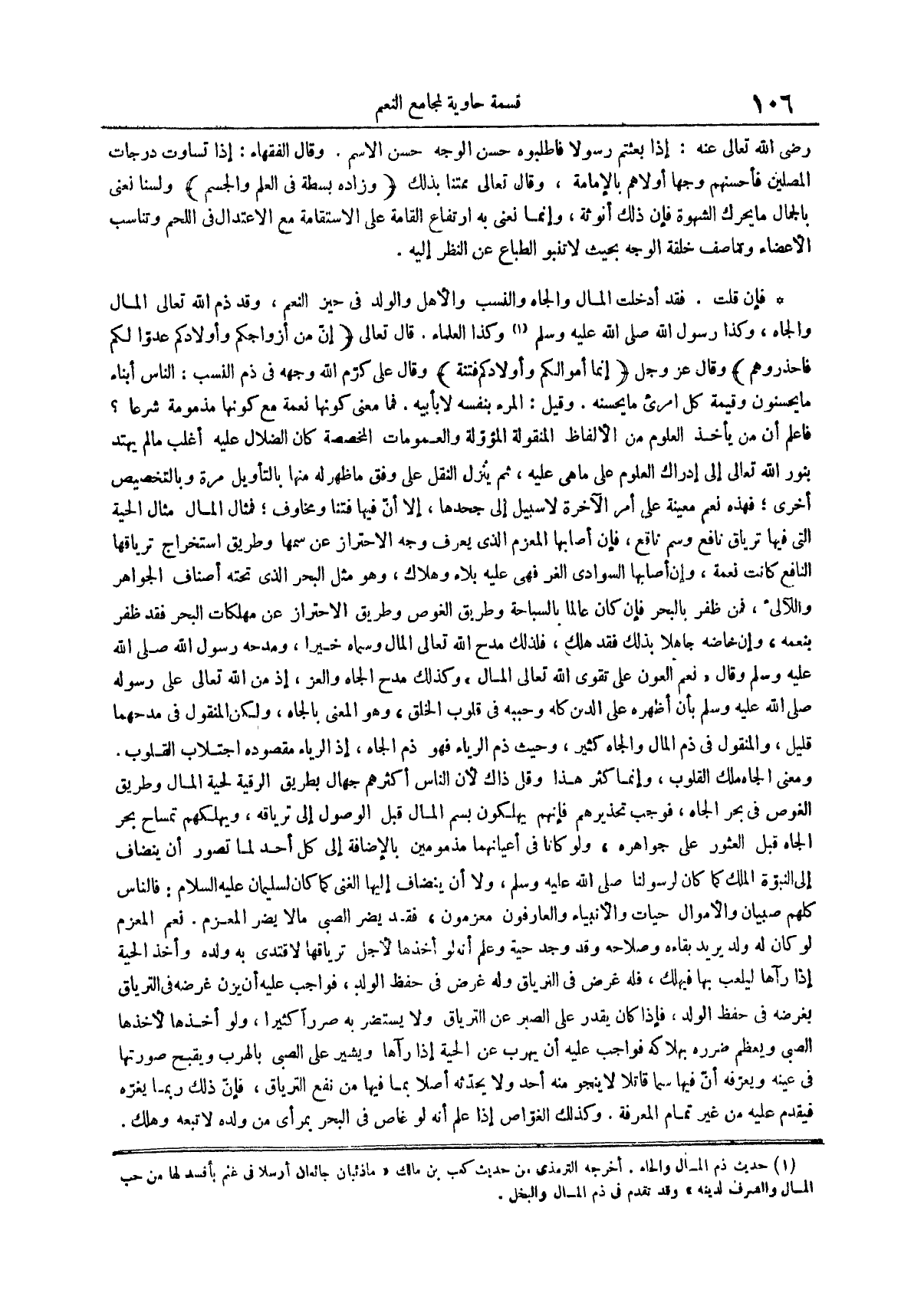 فإن قلت فقد أدخلت المال والجاه والنسب والأهل والولد في حيز النعم وقد ذم الله تعالى المال والجاه وكذا رسول صلى الله عليه وسلم حديث ذم المال والجاه أخرجه الترمذي من حديث كعب بن مالك ما ذئبان جائعان أرسلا في غنم بأفسد لها من حب المال والشرف لدينه وقد تقدم في ذم المال والبخل // وكذا العلماء قال تعالى {إِنَّ مِنْ أَزْوَاجِكُمْ وَأَوْلَادِكُمْ عَدُوًّا لَكُمْ فَاحْذَرُوهُمْ} وقال عز وجل {إنما أموالكم وأولادكم فتنة} وقال علي كرم الله وجهه في ذم النسب الناس أبناء ما يحسنون وقيمة كل امرىء ما يحسنه وقيل المرء بنفسه لا بأبيه فما معنى كونها نعمة مع كونها مذمومة شرعاً فاعلم أن من يأخذ العلوم من الألفاظ المنقولة المؤولة والعمومات المخصصة كان الضلال عليه أغلب ما لم يهتد بنور الله تعالى إلى إدراك العلوم على ما هي عليه ثم ينزل النقل على وفق ما ظهر له منها بالتأويل مرة وبالتخصيص أخرى فهذه نعم معينة على أمر الآخرة لا سبيل إلى جحدها إلا أن فيها فتنا ومخاوف فمثال المال مثال الحية التي فيها ترياق نافع وسم نافع فإن أصابها المعزم الذي يعرف وجه الاحتراز عن سمها وطريق استخراج ترياقها النافع كانت نعمة وإن أصابها السوادي الغر فهي عليه بلاء وهلاك وهو مثل البحر الذي تحته أصناف الجواهر واللآلئ فمن ظفر بالبحر فإن كان عالماً بالسباحة وطريق الغوص وطريق الاحتراز عن مهلكات البحر فقد ظفر بنعمه وإن خاضه جاهلاً بذلك فقد هلك فلذلك مدح الله تعالى المال وسماه خيرا ومدحه رسول صلى الله عليه وسلم وقال نعم العون على تقوى الله تعالى المال وكذلك مدح الجاه والعز إذ من الله تعالى على رسوله صلى الله عليه وسلم بأن أظهره على الدين كله وحببه في قلوب الخلق وهو المعني بالجاه ولكن المنقول في مدحهما قليل والمنقول في ذم المال والجاه كثير وحيث ذم الرياء فهو ذم الجاه إذ الرياء مقصوده اجتلاب القلوب ومعنى الجاه ملك القلوب وإنما كثر هذا وقل ذاك لأن الناس أكثرهم جهال بطريق الرقية لحية المال وطريق الغوص في بحر الجاه فوجب تحذيرهم فإنهم يهلكون بسم المال قبل الوصول إلى ترياقه ويهلكهم تمساح بحر الجاه قبل العثور على جواهره ولو كانا في أعيانهما مذمومين بالإضافة إلى كل أحد لما تصور أن ينضاف إلى النبوة الملك كما كان لرسولنا صلى الله عليه وسلم ولا أن ينضاف إليها الغنى كما كان لسليمان عليه السلام فالناس كلهم صبيان والأموال حيات والأنبياء والعارفون معزمون فقد يضر الصبي مالا يضر المعزم نعم المعزم لو كان له ولد يريد بقاءه وصلاحه وقد وجد حية وعلم أنه لو أخذها لأجل ترياقها لاقتدى به ولده وأخذ الحية إذا رآها ليلعب بها فيهلك فله غرض في الترياق وله غرض في حفظ الولد فواجب عليه أن يزن غرضه في الترياق بغرضه في حفظ الولد فإذا كان يقدر على الصبر عن الترياق ولا يستضر به ضرراً كثيراً ولو أخذها لأخذها الصبي ويعظم ضرره بهلاكهم فواجب عليه أن يهرب عن الحية إذا رآها ويشير على الصبي بالهرب ويقبح صورتها في عينه ويعرفه أن فيها سماً قاتلاً لا ينجو منه أحد ولا يحدثه أصلاً بما فيها من نفع الترياق فإن ذلك ربما يغره فيقدم عليه من غير تمام المعرفة وكذلك الغواص إذا علم أنه لو غاص في البحر بمرأى من ولده لاتبعه وهلك