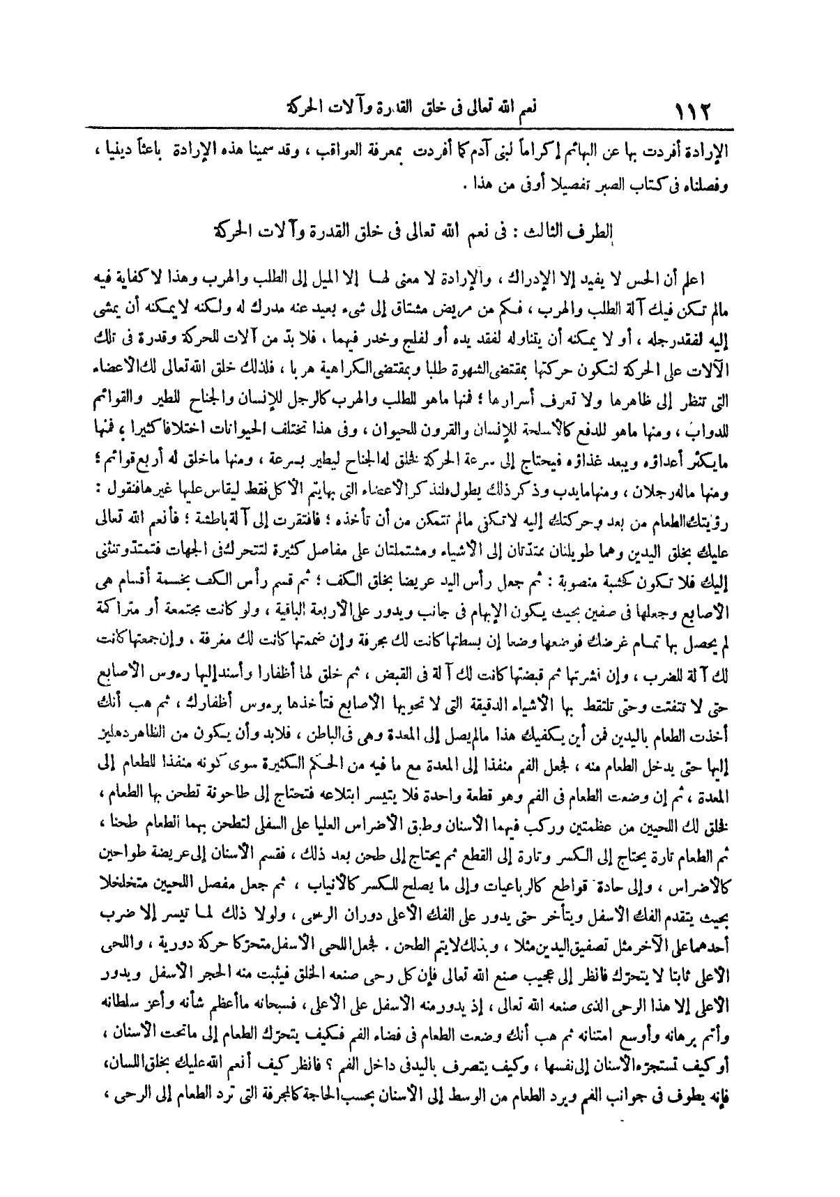 اعلم أن الحس لا يفيد إلا الإدراك والإرادة لا معنى لها إلا الميل إلى الطلب والهرب وهذا لا كفاية فيه ما لم تكن فيك آلة الطلب والهرب فكم من مريض مشتاق إلى شيء بعيد عنه مدرك له ولكنه لا يمكنه أن يمشي إليه لفقد رجله أو لا يمكنه أن يتناوله لفقد يده أو لفلج وخدر فيهما فلا بد من آلات للحركة وقدرة في تلك الآلات على الحركة لتكون حركتها بمقتضى الشهوة طلبا وبمقتضى الكراهية هرباً فلذلك خلق الله تعالى لك الأعضاء التي تنظر إلى ظاهرها ولا تعرف أسرارها فمنها ما هو للطلب والهرب كالرجل للإنسان والجناح للطير والقوائم للدواب ومنها ما هو للدفع كالأسلحة للإنسان والقرون للحيوان وفي هذا تختلف الحيوانات اختلافاً كثيراً فمنها ما يكثر أعداؤه ويبعد غذاؤه فيحتاج إلى سرعة الحركة فخلق له الجناح ليطير بسرعة ومنها ما خلق له أربع قوائم ومنها ما له رجلان ومنها ما يدب وذكر ذلك يطول فلنذكر الأعضاء التي بها يتم الأكل فقط ليقاس عليها غيرها فنقول رؤيتك الطعام من بعد وحركتك إليه لا تكفي ما لم تتمكن من أن تأخذه فافتقرت إلى آلة باطشة فأنعم الله تعالى عليك بخلق اليدين وهم طويلتان ممتدتان إلى الأشياء ومشتملتان على مفاصل كثيرة لتتحرك في الجهات فتمتد وتنثنى إليك فلا تكون كخشبة منصوبة ثم جعل رأس اليد عريضاً بخلق الكف ثم قسم رأس الكف بخمسة أقسام هي الأصابع وجعلها في صفين بحيث يكون الإبهام في جانب ويدور على الأربعة الباقية ولو كانت مجتمعة أو متراكمة لم يحصل به تمام غرضك فوضعها وضعاً إن بسطتها كانت لك مجرفة وإن ضمتها كانت لك مغرفة وإن جمعتها كانت لك آلة للضرب وإن نشرتها ثم قبضتها كانت لك آلة في القبض ثم خلق لها أظفارا وأسند إليها رءؤس الأصابع حتى لا تتفتت وحتى تلتقط بها الأشياء الدقيقة التي لا تحويها الأصابع فتأخذها برءوس أظفارك ثم هب أنك أخذت الطعام باليدين فمن أين يكفيك هذا ما لم يصل إلى المعدة وهي في الباطن فلا بد وأن يكون من الظاهر دهليز إليها حتى يدخل الطعام منه فجعل الفم منفذاً إلى المعدة مع ما فيه من الحكم الكثيرة سوى كونه منفذاً للطعام إلى المعدة ثم إن وضعت الطعام في الفم وهو قطعة واحدة فلا يتيسر ابتلاعه فتحتاج إلى طاحونة تطحن بها الطعام فخلق لك اللحيين من عظمتين وركب فيهما الأسنان وطبق الأضراس العليا على السفلى لتطحن بهما الطعام طحناً ثم الطعام تارة يحتاج إلى الكسر وتارة إلى القطع ثم يحتاج إلى طحن بعد ذلك فقسم الأسنان إلى عريضة طواحين كالأضراس وإلى حادة قواطع كالرباعيات وإلى ما يصلح للكسر كالأنياب ثم جعل مفصل اللحيين متخلخلاً بحيث يتقدم الفك الأسفل ويتأخر حتى يدور على الفك الأعلى دوران الرخى ولولا ذلك لما تيسر إلا ضرب أحدهما على الآخر مثل تصفيق اليدين مثلاً وبذلك لا يتم الطحن فجعل اللحي الأسفل متحركاً حركة دورية واللحي الأعلى ثابتاً لا يتحرك فانظر إلى عجيب صنع الله تعالى فإن كل رحى صنعه الخلق فيثبت منه الحجر الأسفل ويدور الأعلى إلا هذا الرحى الذي صنعه الله تعالى إذ يدور منه الأسفل على الأعلى فسبحانه ما أعظم شأنه وأعز سلطانه وأتم برهانه وأوسع امتنانه ثم هب أنك وضعت الطعام في فضاء الفم فكيف يتحرك الطعام إلى ما تحت الأسنان أو كيف تستجره الأسنان إلى نفسها وكيف يتصرف باليد في داخل الفم فانظر كيف أنعم الله عليك بخلق اللسان فإنه يطوف في جوانب الفم ويرد الطعام من الوسط إلى الأسنان بحسب الحاجة كالمجرفة التي ترد الطعام إلى الرحى