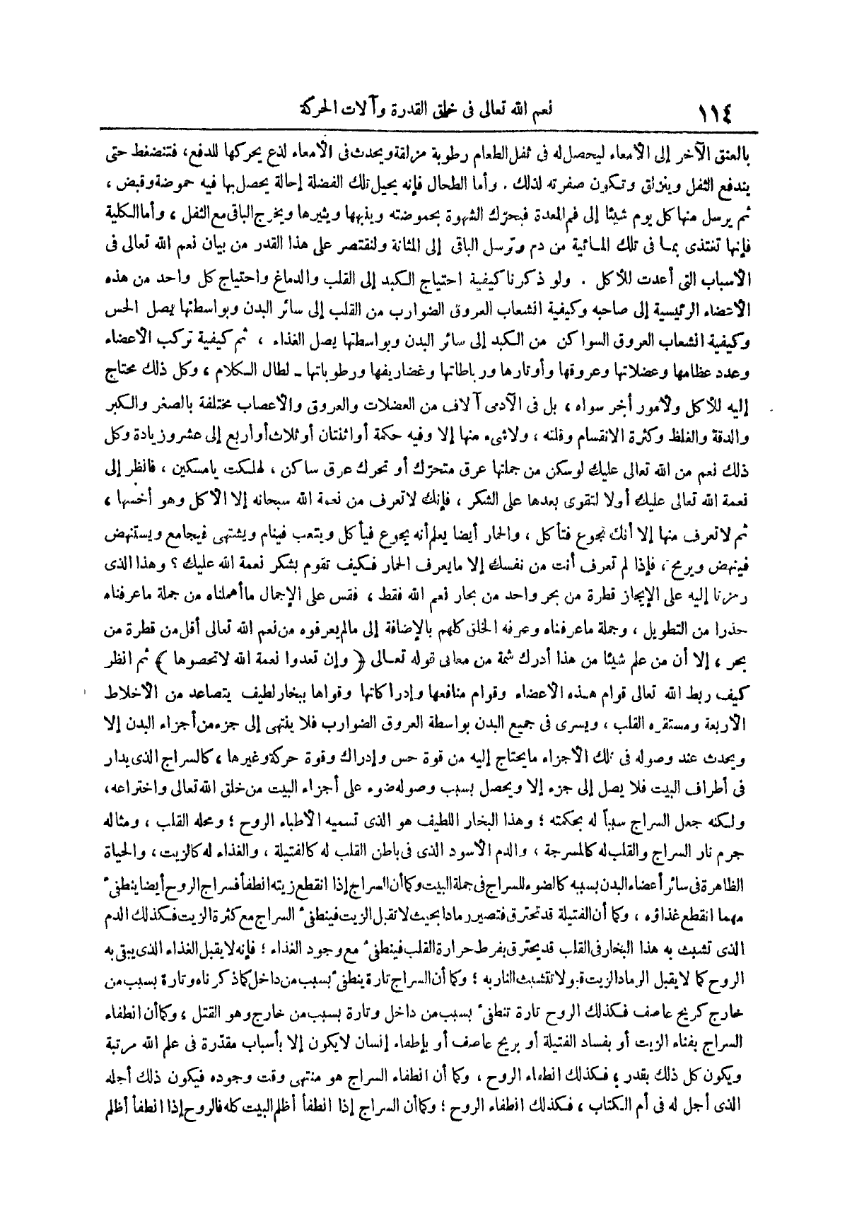 بالعنق الآخر إلى الأمعاء ليحصل له في ثفل الطعام رطوبة مزلقة ويحدث في الأمعاء لذع يحركها للدفع فتنضغط حتى يندفع الثفل وينزلق وتكون صفرته لذلك وأما الطحال فإنه يحيل تلك الفضلة إحالة يحصل بها فيه حموضة وقبض ثم يرسل منها كل يوم شيئاً إلى فم المعدة فيحرك الشهوة بحموضته وينبهها ويثيرها ويخرج الباقي مع الثفل وأما الكلية فإنها تغتذي بما في تلك المائية من دم وترسل الباقي إلى المثانة ولنقتصر على هذا القدر من بيان نعم الله تعالى في الأسباب التي أعدت للأكل ولو ذكرنا كيفية احتياج الكبد إلى القلب والدماغ واحتياج كل واحد من هذه الأعضاء الرئيسية إلى صاحبه وكيفية انشعاب العروق الضوارب من القلب إلى سائر البدن وبواسطتها يصل الحس وكيفية انشعاب العروق السواكن من الكبد إلى سائر البدن وبواسطتها يصل الغذاء ثم كيفية تركب الأعضاء وعدد عظامها وعضلاتها وعروقها وأوتارها ورباطاتها وغضاريفها ورطوباتها لطال الكلام وكل ذلك محتاج إليه للأكل ولأمور أخر سواه بل في الآدمي آلاف من العضلات والعروق والأعصاب مختلفة بالصغر والكبر والدقة والغلظ وكثرة الانقسام وقلته ولا شيء منها إلا وفيه حكمة أو اثنتان أو ثلاث أو أربع إلى عشر وزيادة وكل ذلك نعم من الله تعالى عليك لو سكن من جملتها عرق متحرك أو تحرك عرق ساكن لهلكت يا مسكين فانظر إلى نعمة الله تعالى عليك أو لا لتقوى بعدها على الشكر فإنك لا تعرف من نعمة الله سبحانه إلا الأكل وهو أخسها ثم لا تعرف منها إلا أنك تجوع فتأكل والحمار أيضاً يعلم أنه يجوع فيأكل ويتعب فينام ويشتهي فيجامع ويستنهض فينهض ويرمح فإذا لم تعرف أنت من نفسك إلا ما يعرف الحمار فكيف تقوم بشكر نعمة الله عليك وهذا الذي رمزنا إليه على الإيجاز قطرة من بحر واحد من بحار نعم الله فقط فقس على الإجمال ما أهملناه من جملة ما عرفناه حذراً من التطويل وجملة ما عرفناه وعرفه الخلق كلهم بالإضافة إلى ما لم يعرفوه من نعم الله تعالى أقل من قطرة من بحر إلا أن من علم شيئاً من هذا أدرك شمة من معاني قوله تعالى {وإن تعدوا نعمة الله لا تحصوها} ثم انظر كيف ربط الله تعالى قوام هذه الأعضاء وقوام منافعها وإدراكاتها وقواها ببخار لطيف يتصاعد من الأخلاط الأربعة ومستقره القلب ويسري في جميع البدن بواسطة العروق الضوارب فلا ينتهي إلى جزء من أجزاء البدن إلا ويحدث عند وصوله في تلك الأجزاء ما يحتاج إليه من قوة حس وإدراك وقوة حركة وغيرها كالسراج الذي يدار في أطراف البيت فلا يصل إلى جزء إلا ويحصل بسبب وصوله ضوء على أجزاء البيت من خلق الله تعالى واختراعه ولكنه جعل السراج سبباً له بحكمته وهذا البخار اللطيف هو الذي تسميه الأطباء الروح ومحله القلب ومثاله جرم نار السراج والقلب له كالمسرجة والدم الأسود الذي في باطن القلب له كالفتيلة والغذاء له كالزيت والحياة الظاهرة في سائر أعضاء البدن بسببه كالضوء للسراج في جملة البيت وكما أن السراج إذا انقطع زيته انطفأ فسراج الروح أيضا ينطفىء مهما انقطع غذاؤه وكما أن الفتيلة قد تحترق فتصير رماداً بحيث لا تقبل الزيت فينطفىء السراج مع كثرة الزيت فكذلك الدم الذي تشبث به هذا البخار في القلب قد يحترق بفرط حرارة القلب فينطفىء مع وجود الغذاء فإنه لا يقبل الغذاء الذي يبقى به الروح كما لا يقبل الرماد الزيت قبولا تتشبث النار به وكما أن السراج تارة ينطفىء بسبب من داخل كما ذكرناه وتارة بسبب من خارج كريح عاصف فكذلك الروح تارة تنطفىء بسبب من داخل وتارة بسبب من خارج وهو القتل وكما أن انطفاء السراج بفناء الزيت أو بفساد الفتيلة أو بريح عاصف أو بإطفاء إنسان لا يكون إلا بأسباب مقدرة في علم الله مرتبة ويكون كل ذلك بقدر فكذلك انطفاء الروح وكما أن انطفاء السراج هو منتهى وقت وجوده فيكون ذلك أجله الذي أجل له في أم الكتاب فكذلك انطفاء الروح وكما أن السراج إذا انطفأ أظلم البيت كله فالروح إذا انطفأ أظلم