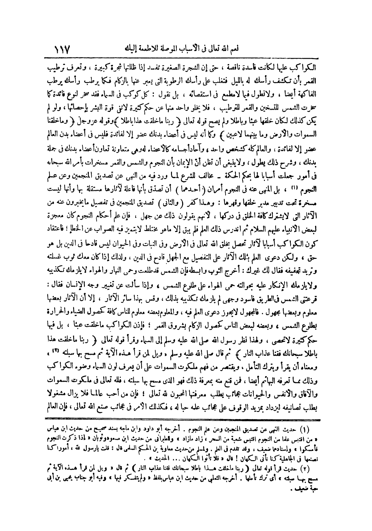 الكواكب عليها لكانت فاسدة ناقصة حتى إن الشجرة الصغيرة تفسد إذا ظللتها شجرة كبيرة وتعرف ترطيب القمر بأن تكشف رأسك له بالليل فتغلب على رأسك الرطوبة التي يعبر عنها بالزكام فكما يرطب رأسك يرطب الفاكهة أيضاً ولا نطول فيما لا مطمع في استقصائه بل نقول كل كوكب في السماء فقد سخر لنوع فائدة كما سخرت الشمس للتسخين والقمر للترطيب فلا يخلو واحد منها عن حكم كثيرة لا تفي قوة البشر بإحصائها ولو لم يكن كذلك لكان خلقها عبثاً وباطلاً ولم يصح قوله تعالى {ربنا ما خلقت هذا باطلاً} وقوله عز وجل وما خلقنا السموات والأرض وما بينهما لاعبين وكما أنه ليس في أعضاء بدنك عضو إلا لفائدة فليس في أعضاء بدن العالم عضو إلا لفائدة والعالم كله كشخص واحد وآحاد أجسامه كالأعضاء له وهي متعاونة تعاون أعضاء بدنك في جملة بدنك وشرح ذلك يطول ولا ينبغي أن تظن أن الإيمان بأن النجوم والشمس والقمر مسخرات بأمر الله سبحانه في أمور جعلت أسباباً لها بحكم الحكمة مخالف للشرع لما ورد فيه من النهي عن تصديق المنجمين وعن علم النجوم // حديث النهي عن تصديق المنجمين وعن علم النجوم أخرجه أبو داود وابن ماجه بسند صحيح من حديث ابن عباس من اقتبس علما من النجوم اقتبس شعبة من السحر زاد ما زاد وللطبرانى من حديث ابن مسعود وثوبان إذا ذكرت النجوم فأمسكوا وإسنادهما ضعيف وقد تقدم فى العلم ولمسلم من حديث معاوية بن الحكم السلمى قال قلت يا رسول لله أمورا كنا نصنعها فى الجاهلية كنا نأتى الكهان قال فلا تأتوا الكهان الحديث