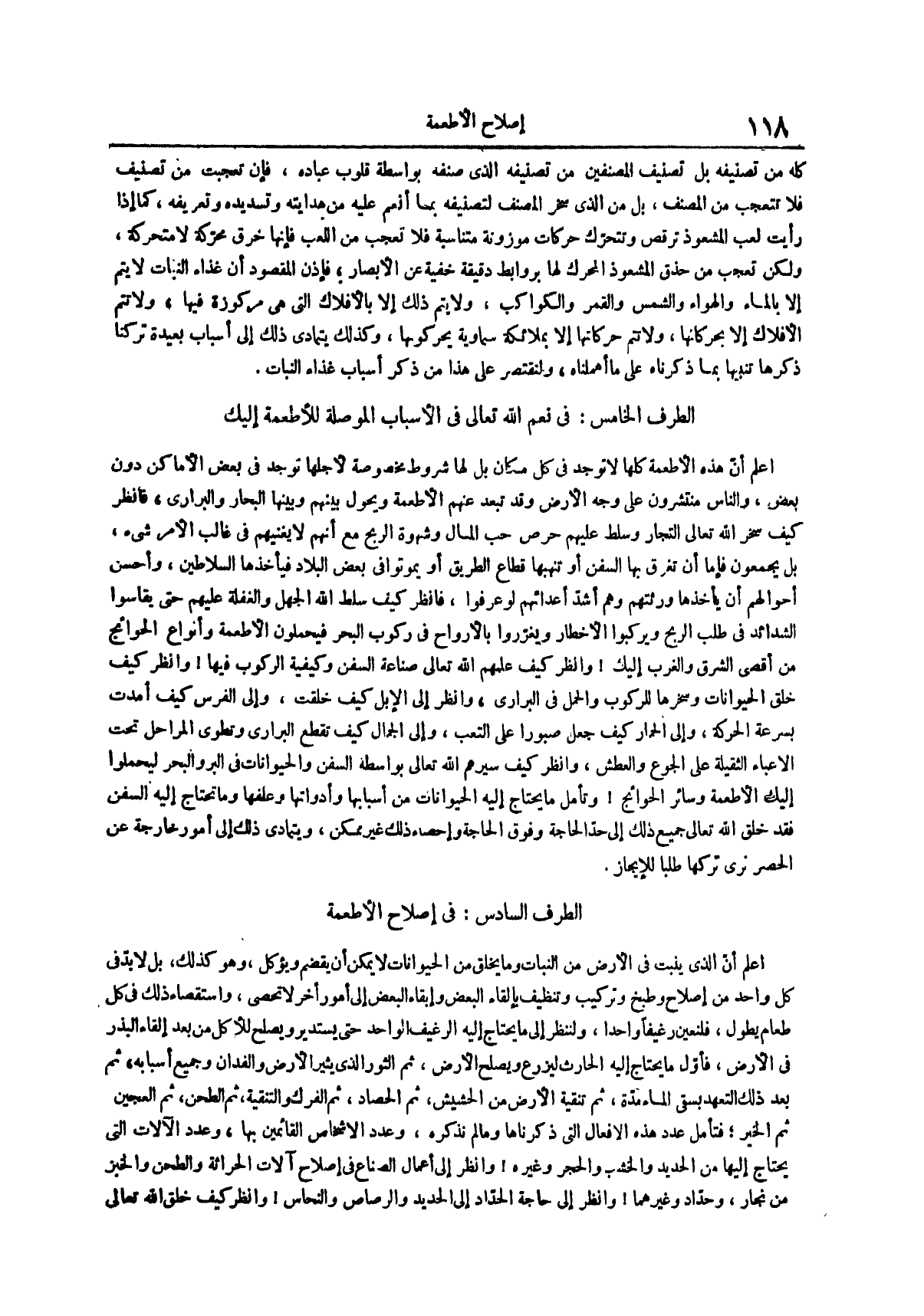 اعلم أن الذي ينبت في الأرض من النبات وما يخلق من الحيوانات لا يمكن أن يقضم ويؤكل وهو كذلك بل لا بد في كل واحد من إصلاح وطبخ وتركيب وتنظيف بإلقاء البعض وإبقاء البعض إلى أمور أخر لا تحصى واستقصاء ذلك في كل طعام يطول فلنعين رغيفاً واحداً ولننظر إلى ما يحتاج إليه الرغيف الواحد حتى يستدير ويصلح للأكل من بعد إلقاء البذر في الأرض فأول ما يحتاج إليه الحارث ليزرع ويصلح الأرض ثم الثور الذي يثير الأرض والفدان وجميع أسبابه ثم بعد ذلك التعهد بسقي الماء مدة ثم تنقية الأرض من الحشيش ثم الحصاد ثم الفرك والتنقية ثم الطحن ثم العجين ثم الخير فتأمل عدد هذه الأفعال التي ذكرناها وما لم نذكره وعدد الأشخاص القائمين بها وعدد الآلات التي يحتاج إليها من الحديد والخشب والحجر وغيره وانظر إلى أعمال الصناع في إصلاح آلات الحراثة والطحن والخبز من نجار وحداد وغيرهما وانظر إلى حاجة الحداد إلى الحديد والرصاص والنحاس وانظر كيف خلق الله تعالى