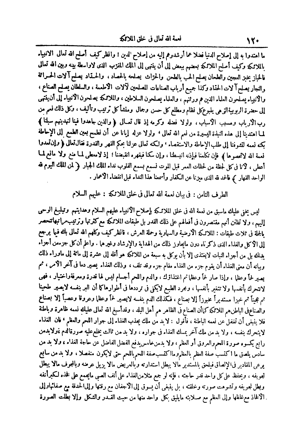 ما اهتدوا به إلى إصلاح الدنيا فضلاً عما أرشدوهم إليه من إصلاح الدين وانظر كيف أصلح الله تعالى الأنبياء بالملائكة وكيف أصلح الملائكة بعضهم ببعض إلى أن ينتهي إلى الملك المقرب الذى لاواسطه بينه وبين الله تعالى فالخباز يخبز العجين والطحان يصلح الحب بالطحن والحراث يصلحه بالحصاد والحداد يصلح آلات الحراثة والنجار يصلح آلات الحداد وكذا جميع أرباب الصناعات المصلحين لآلات الأطعمة والسلطان يصلح الصناع والأنبياء يصلحون العلماء الذين هم ورثتهم والعلماء يصلحون السلاطين والملائكة يصلحون الأنبياء إلى أن ينتهي إلى حضرة الربوبية التي هي ينبوع كل نظام ومطلع كل حسن وجمال ومنشأ كل ترتيب وتأليف وكل ذلك نعم من رب الأرباب ومسبب الأسباب ولولا فضله وكرمه إذ قال تعالى {والذين جاهدوا فينا لنهدينهم سبلنا} لما اهتدينا إلى هذه النبذة اليسيرة من نعم الله تعالى ولولا عزله إيانا عن أن نطمح بعين الطمع إلى الإحاطة بكنه نعمه لتشوفنا إلى طلب الإحاطة والاستقصاء ولكنه تعالى عزلنا بحكم القهر والقدرة فقال تعالى {وإن تعدوا نعمة الله لا تحصوها} فإن تكلمنا فبإذنه انبسطنا وإن سكنا فبقهره انقبضنا إذ لا معطي لما منع ولا مانع لما أعطى لأنا في كل لحظة من لحظات العمر قبل الموت نسمع بسمع القلوب نداء الملك الجبار {لمن الملك اليوم لله الواحد القهار} فالحمد لله الذي ميزنا عن الكفار وأسمعنا هذا النداء قبل انقضاء الأعمار