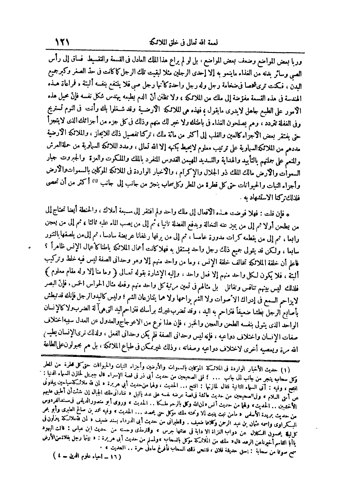 وربا بعض المواضع وضعف بعض المواضع بل لو لم يراع هذا الملك العادل في القسمة والتقسيط فساق إلى رأس الصبي وسائر بدنه من الغذاء ما ينمو به إلا إحدى الرجلين مثلاً لبقيت تلك الرجل كما كانت في حد الصغر وكبر جميع البدن فكنت ترى شخصاً في ضخامة رجل وله رجل واحدة كأنها رجل صبي فلا ينتفع بنفسه البتة فمراعاة هذه الهندسة في هذه القسمة مفوضة إلى ملك من الملائكة ولا تظنن أن الدم بطبعه يهندس شكل نفسه فإن محيل هذه الأمور على الطبع جاهل لا يدري ما يقول فهذه هي الملائكة الأرضية وقد شغلوا بك وأنت في النوم تستريح وفي الغفلة تتردد وهم يصلحون الغذاء في باطنك ولا خبر لك منهم وذلك في كل جزء من أجزائك الذي لا يتجزأ حتى يفتقر بعض الأجزاء كالعين والقلب إلى أكثر من مائة ملك تركنا تفصيل ذلك للإيجاز والملائكة الأرضية مددهم من الملائكة السماوية على ترتيب معلوم لا يحيط بكنهه إلا الله تعالى ومدد الملائكة السماوية من حملة العرش والمنعم على جملتهم بالتأييد والهداية والتسديد المهيمن القدوس المنفرد بالملك والملكوت والعزة والجبروت جبار السموات والأرض مالك الملك ذو الجلال والإكرام والأخبار الواردة في الملائكة الموكلين بالسموات والأرض وأجزاء النبات والحيوانات حتى كل قطرة من المطر وكل سحاب ينجر من جانب إلى جانب (¬1) أكثر من أن تحصى فلذلك تركنا الاستشهاد به