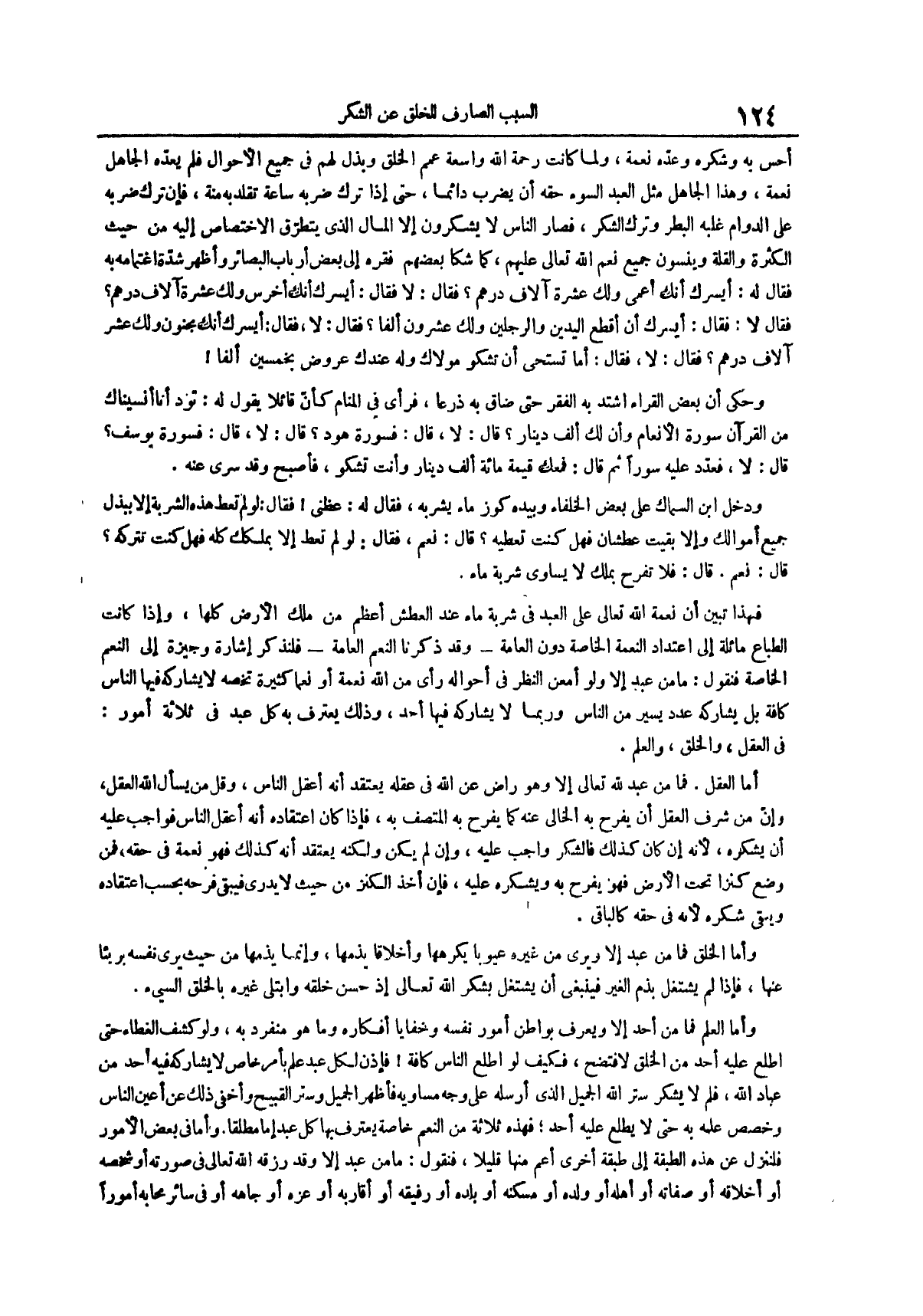 أما العقل فما من عبد لله تعالى إلا وهو راض عن الله في عقله يعتقد أنه أعقل الناس وقل من يسأل الله العقل وإن من شرف العقل أن يفرح به الخالي عنه كما يفرح به المتصف به فإذا كان اعتقاده أنه أعقل الناس فواجب عليه أن يشكره لأنه إن كان كذلك فالشكر واجب عليه وإن لم يكن ولكنه يعتقد أنه كذلك فهو نعمة في حقه فمن وضع كنزاً تحت الأرض فهو يفرح به ويشكره عليه فإن أخذ الكنز من حيث لا يدري فيبقى فرحه بحسب اعتقاده ويبقى شكره لأنه في حقه كالباقي