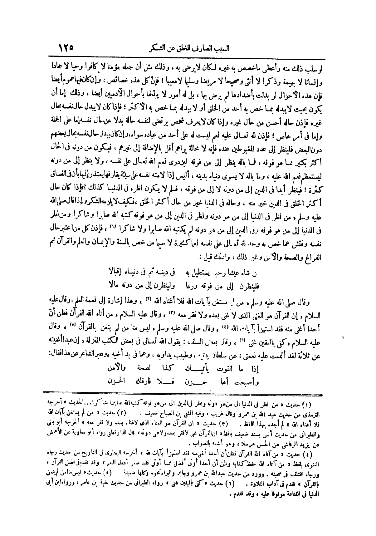 (¬1) حديث من نظر في الدنيا إلى من هو دونه ونظر في الدين إلى من هو فوقه كتبه الله صابرا وشاكرا الحديث أخرجه الترمذى من حديث عبد الله بن عمرو وقال غريب وفيه المثنى بن الصباح ضعيف لا غناء بعده ولا فقر معه أخرجه أبو يمنى والطبرانى من حديث أنس بسند ضعيف بلفظ أن القرآن غنى لا فقر بعده ولا غنى دونه قال الدارقطنى رواه أبو معاوية عن الأعمش عن يزيد الرقاشى عن الحسن مرسلا وهو أشبه بالصوابفإذن كل من اعتبر حال نفسه وفتش عما خص به وحد الله تعالى على نفسه نعماً كثيرة لا سيما من خص بالسنة والإيمان والعلم والقرآن ثم الفراغ والصحة والأمن وغير ذلك وقيل