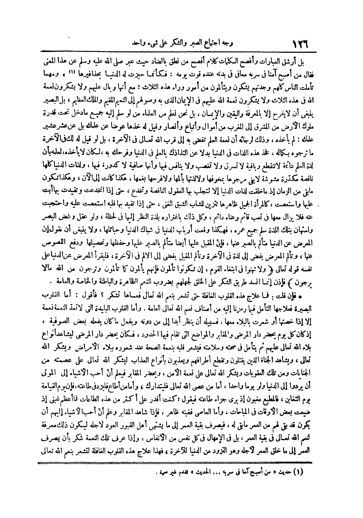 بل أرشق العبارات وأفصح الكلمات كلام أفصح من نطق بالضاد حيث عبر صلى الله عليه وسلم عن هذا المعنى فقال من أصبح آمناً في سربه معافى في بدنه عِنْدَهُ قُوتُ يَوْمِهِ فَكَأَنَّمَا حِيزَتْ لَهُ الدُّنْيَا بحذافيرها (¬1) ومهما تأملت الناس كلهم وجدتهم يشكون ويتألمون من أمور وراء هذه الثلاث مع أنها وبال عليهم ولا يشكرون نعمة الله في هذه الثلاث ولا يشكرون نعمة الله عليهم في الإيمان الذي به وصولهم إلى النعيم المقيم والملك العظيم بل البصير بنبغى أن لا يفرح إلا بالمعرفة واليقين والإيمان بل نحن نعلم من العلماء من لو سلم إليه جميع ما دخل تحت قدرة ملوك الأرض من المشرق إلى المغرب من أموال وأتباع وأنصار وقيل له خذها عوضاً عن علمك بل عن عشر عشير علمك لم يأخذه وذلك لرجائه أن نعمة العلم تفضي به إلى قرب الله تعالى في الآخرة بل لو قيل له لك في الآخرة ما ترجوه بكماله فخذ هذه اللذات في الدنيا بدلاً عن التذاذك بالعلم في الدنيا وفرحك به لكان لا يأخذه لعلمه بأن لذة العلم دائمة لا تنقطع وباقية لا تسرق ولا تعصب ولا ينافس فيها وأنها صافية لا كدورة فيها ولذات الدنيا كلها ناقصة مكدرة مشوشة لا يفي مرجوها بمخوفها ولا لذتها بألمها ولا فرحها بغمها هكذا كانت إلى الآن وهكذا تكون ما بقي من الزمان إذ ما خلقت لذات الدنيا إلا لتجلب بها العقول الناقصة وتخدع حتى إذا انخدعت وتقيدت بها أبت عليها واستعصت كالمرأة الجميل ظاهرها تتزين للشاب الشبق الغني حتى إذا تقيد بها قلبه استعصت عليه واحتجبت عنه فلا يزال معها في تعب قائم وعناء دائم وكل ذلك باغتراره بلذة النظر إليها في لحظة ولو عقل وغض البصر واستهان بتلك اللذة سلم جميع عمره فهكذا وقعت أرباب الدنيا في شباك الدنيا وحبائلها ولا ينبغي أن نقول إن المعرض عن الدنيا متألم بالصبر عنها فإن المقبل عليها أيضاً متألم بالصبر عليها وحفظها وتحصيلها ودفع اللصوص عنها وتألم المعرض يفضي إلى لذة في الآخرة وتألم المقبل يفضي إلى الألم في الآخرة فليقرأ المعرض عن الدنيا على نفسه قوله تعالى ولا تهنوا في ابتغاء القوم إن تكونوا تألمون فإنهم يألمون كما تألمون وترجون من الله ما لا يرجون فإذن إنما انسد طريق الشكر على الخلق لجهلهم بضروب النعم الظاهرة والباطنة والخاصة والعامة