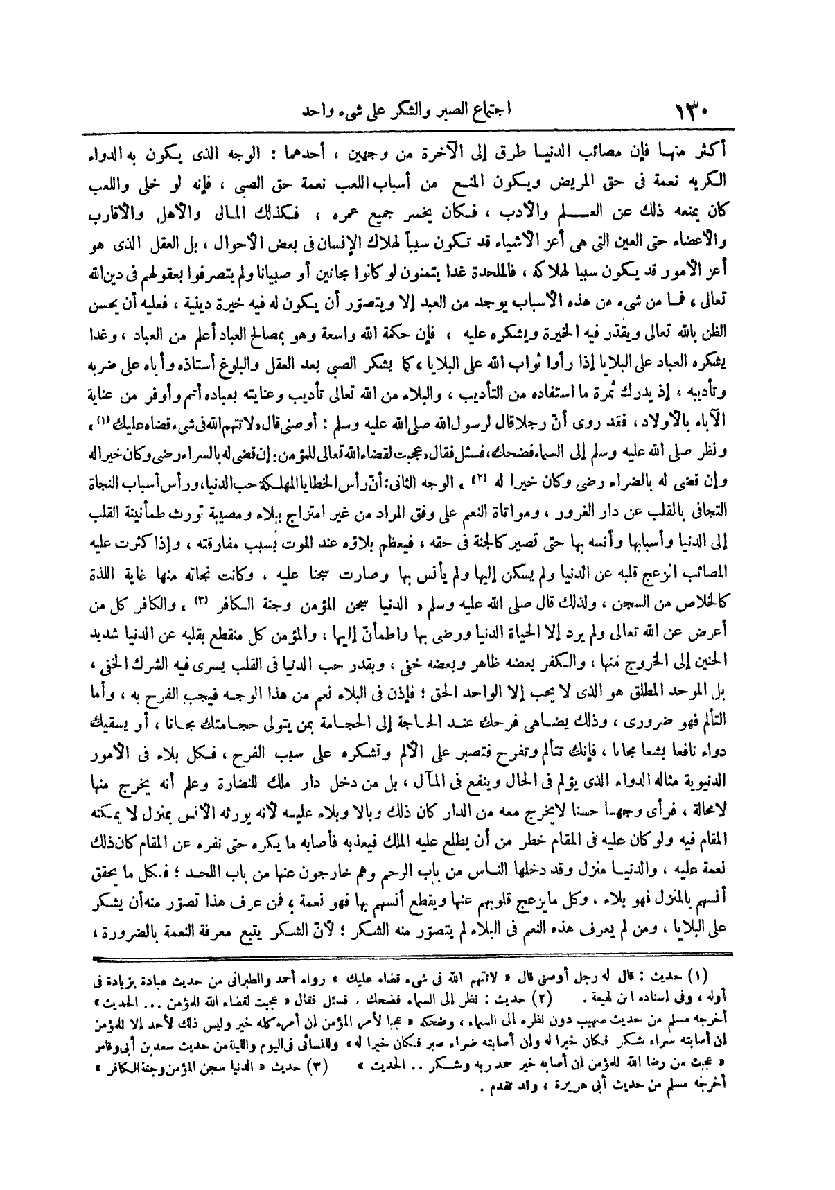 أَكْثَرُ مِنْهَا فَإِنَّ مَصَائِبَ الدُّنْيَا طُرُقٌ إِلَى الآخرة من وجهين أحدهما الوجه الذي يكون به الدواء الكريه نعمة في حق المريض ويكون المنع من أسباب اللعب نعمة حق الصبي فإنه لو خلي واللعب كان يمنعه ذلك عن العلم والأدب فكان يخسر جميع عمره فكذلك المالى والأهل والأقارب والأعضاء حتى العين التي هي أعز الأشياء قد تكون سبباً لهلاك الإنسان في بعض الأحوال بل العقل الذي هو أعز الأمور قد يكون سبباً لهلاكه فالملحدة غداً يتمنون لو كانوا مجانين أو صبياناً ولم يتصرفوا بعقولهم في دين الله تعالى فما من شيء من هذه الأسباب يوجد من العبد إلا ويتصور أن يكون له فيه خيرة دينية فعليه أن يحسن الظن بالله تعالى ويقدر فيه الخيرة ويشكره عليه فإن حكمة الله واسعة وهو بمصالح العباد أعلم من العباد وغداً يشكره العباد على البلايا إذا رأوا ثواب الله على البلايا كما يشكر الصبي بعد العقل والبلوغ أستاذه وأباه على ضربه وتأديبه إذيدرك ثمرة ما استفاده من التأديب والبلاء من الله تعالى تأديب وعنايته بعباده أتم وأوفر من عناية الآباء بالأولاد فقد روي أن رجلاً قَالَ لِرَسُولِ اللَّهِ صَلَّى اللَّهُ عَلَيْهِ وَسَلَّمَ أوصني قال لا تتهم الله في شيء قضاه عليك (¬1) ونظر صلى الله عليه وسلم إلى السماء فضحك فسئل فقال عجبت لقضاء الله تعالى للمؤمن إن قضى له بالسراء رضي وكان خيراً له وإن قضى له بالضراء رضي وكان خيراً له (¬2) الوجه الثاني أن رأس الخطايا المهلكة حب الدنيا ورأس أسباب النجاة التجافي بالقلب عن دار الغرور ومواتاة النعم على وفق المراد من غير امتزاج ببلاء ومصيبة تورث طمأنينة القلب إلى الدنيا وأسبابها وأنسه بها حتى تصير كالجنة في حقه فيعظم بلاؤه عند الموت بسبب مفارقته وإذا كثرت عليه المصائب انزعج قلبه عن الدنيا ولم يسكن إليها ولم يأنس بها وصارت سجناً عليه وكانت نجاته منها غاية اللذة كالخلاص من السجن ولذلك قال صلى الله عليه وسلم الدنيا سجن المؤمن وجنة الكافر (¬3) والكافر كل من أعرض عن الله تعالى ولم يرد إلا الحياة الدنيا ورضي بها واطمأن إليها والمؤمن كل منقطع بقلبه عن الدنيا شديد الحنين إلى الخروج منها والكفر بعضه ظاهر وبعضه خفي وبقدر حب الدنيا في القلب يسري فيه الشرك الخفي بل الموحد المطلق هو الذي لا يحب إلا الواحد الحق فإذن في البلاء نعم من هذا الوجه فيجب الفرح به وأما التألم فهو ضروري وذلك يضاهي فرحك عند الحاجة إلى الحجامة بمن يتولى حجامتك مجاناً أو يسقيك دواءً نافعاً بشعاً مجاناً فإنك تتألم وتفرح فتصبر على الألم وتشكره على سبب الفرح فكل بَلَاءٍ فِي الْأُمُورِ الدُّنْيَوِيَّةِ مِثَالُهُ الدَّوَاءُ الَّذِي يؤلم في الحال وينفع في المآل بل من دخل دار ملك للنضارة وعلم أنه يخرج منها لا محالة فرأى وجهاً حسناً لا يخرج معه من الدار كان ذلك وبالاً وبلاءً عليه لأنه يورثه الأنس بمنزل لا يمكنه المقام فيه ولو كان عليه في المقام خطر من أن يطلع عليه الملك فيعذبه فأصابه ما يكره حتى نفره عن المقام كان ذلك نعمة عليه والدنيا منزل وقد دخلها الناس من باب الرحم وهم خارجون عنها من باب اللحد فكل ما يحقق أنسهم بالمنزل فهو بلاء وكل ما يزعج قلوبهم عنها ويقطع أنسهم بها فهو نعمة فَمَنْ عَرَفَ هَذَا تُصُوِّرَ مِنْهُ أَنْ يَشْكُرَ عَلَى الْبَلَايَا وَمَنْ لَمْ يَعْرِفْ هَذِهِ النِّعَمَ فِي الْبَلَاءِ لَمْ يُتَصَوَّرْ مِنْهُ الشُّكْرُ لِأَنَّ الشكر يتبع معرفة النعمة بالضرورة