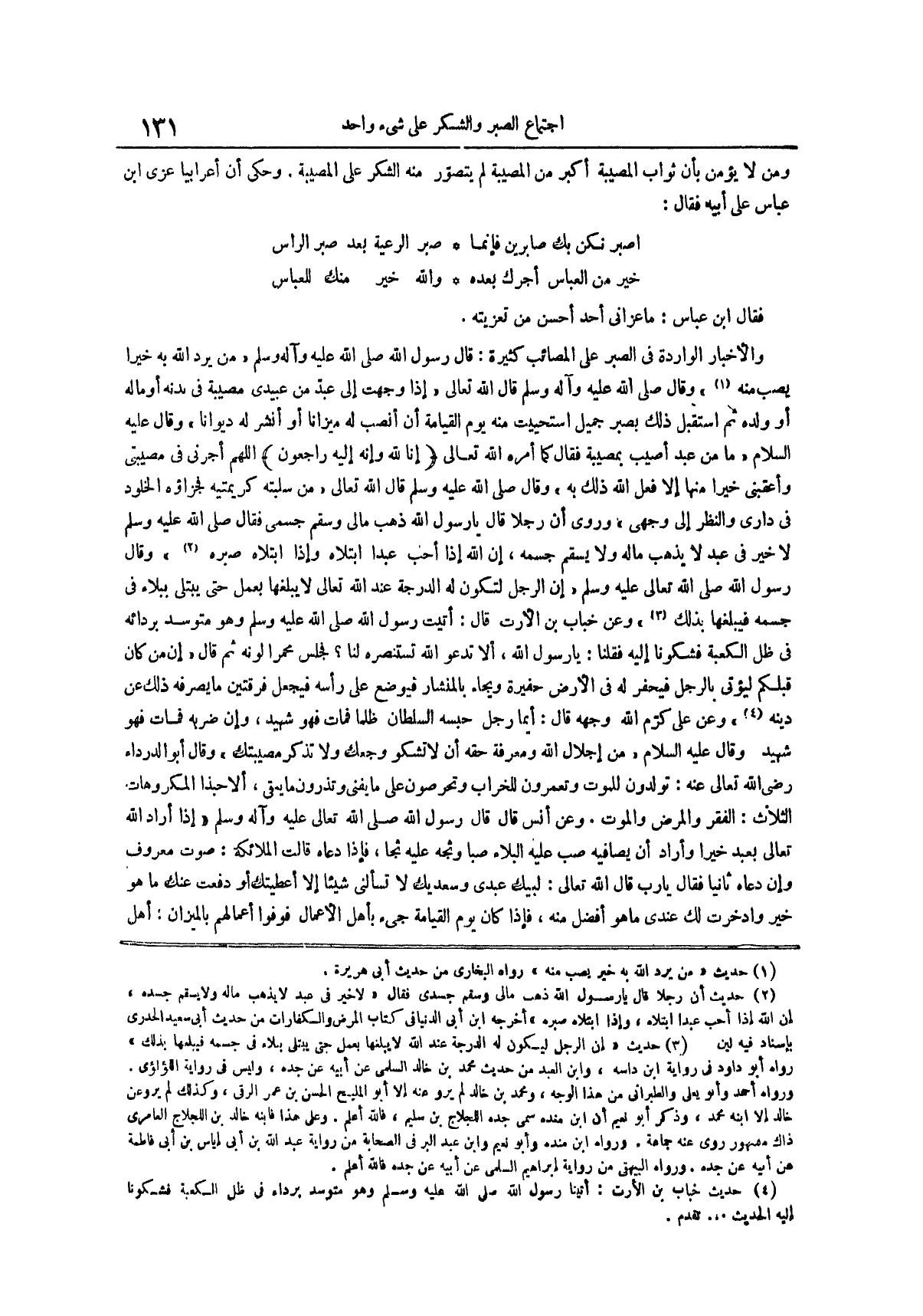 وَمَنْ لَا يُؤْمِنُ بِأَنَّ ثَوَابَ الْمُصِيبَةِ أَكْبَرُ مِنَ الْمُصِيبَةِ لَمْ يُتَصَوَّرْ مِنْهُ الشُّكْرُ عَلَى المصيبة وحكي أن أعرابياً عزى ابن عباس على أبيه فقال