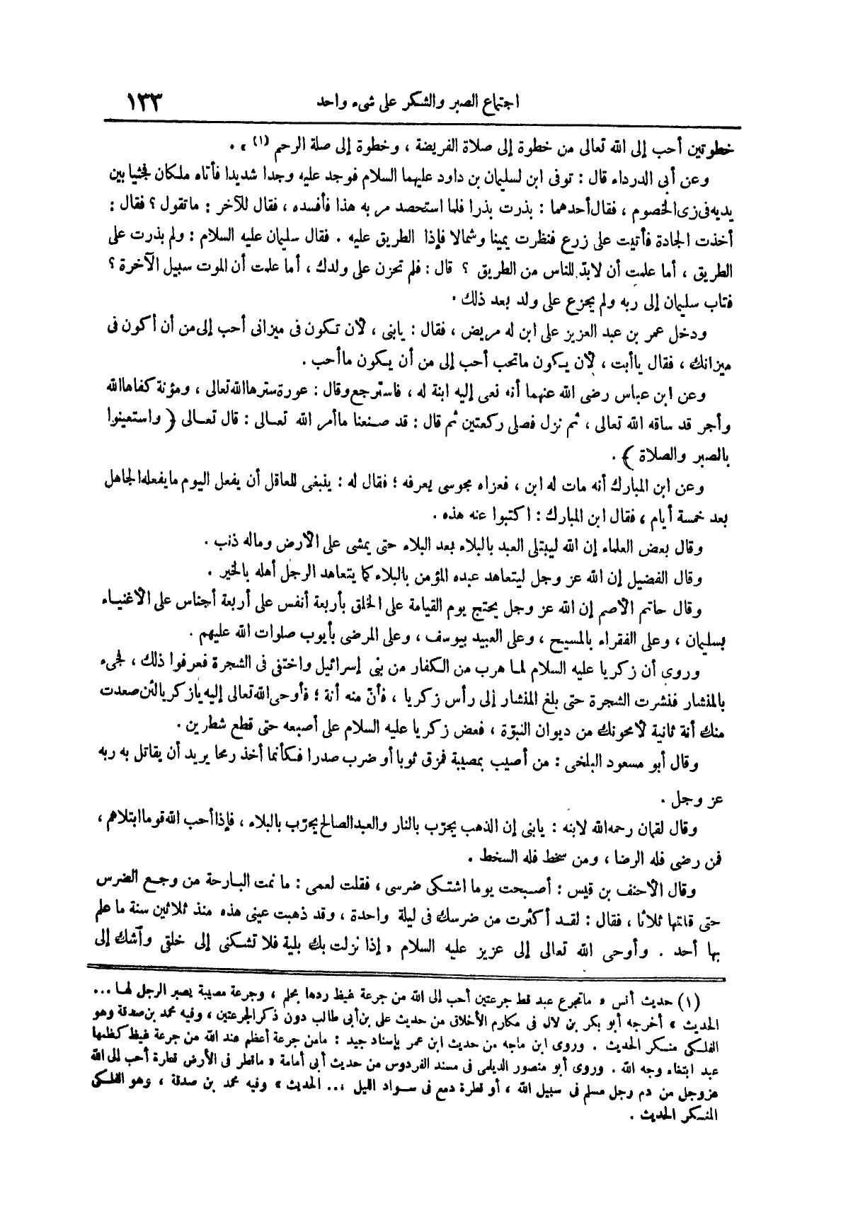 وعن أبي الدرداء قال توفي ابن لسليمان بن داود عليهما السلام فوجد عليه وجداً شديدا فأتاه ملكان فجثيا بين يديه في زي الخصوم فقال أحدهما بذرت بذراً فلما استحصد مر به هذا فأفسده فقال للآخر ما تقول فقال أخذت الجادة فأتيت على زرع فنظرت يميناً وشمالاً فإذا الطريق عليه فقال سليمان عليه السلام ولم بذرت على الطريق أما علمت أن لا بد للناس من الطريق قال فلم تحزن على ولدك أما علمت أن الموت سبيل الآخرة فتاب سليمان إلى ربه ولم يجزع على ولد بعد ذلك