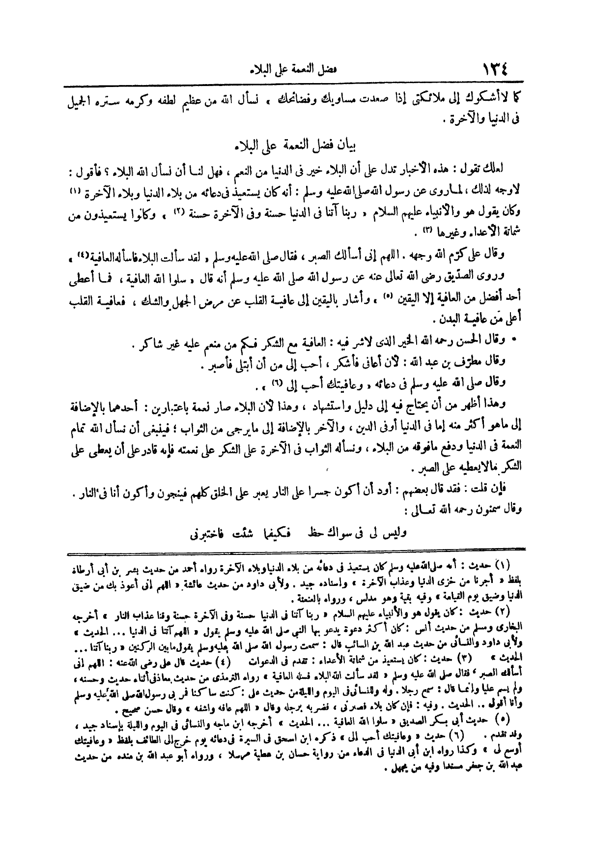 وقال صلى الله عليه وسلم في دعائه وعافيتك أحب إلي (¬6) وهذا أظهر من أن يحتاج فيه إلى دليل واستشهاد وهذا لأن البلاء صار نعمة باعتبارين أحدهما بالإضافة إلى ما هو أكثر منه إما في الدنيا أو في الدين والآخر بالإضافة إلى ما يرجى من الثواب فينبغي أن نسأل الله تمام النعمة في الدنيا ودفع ما فوقه من البلاء ونسأله الثواب في الآخرة على الشكر على نعمته فإنه قادر على أن يعطي على الشكر ما لا يعطيه على الصبر
