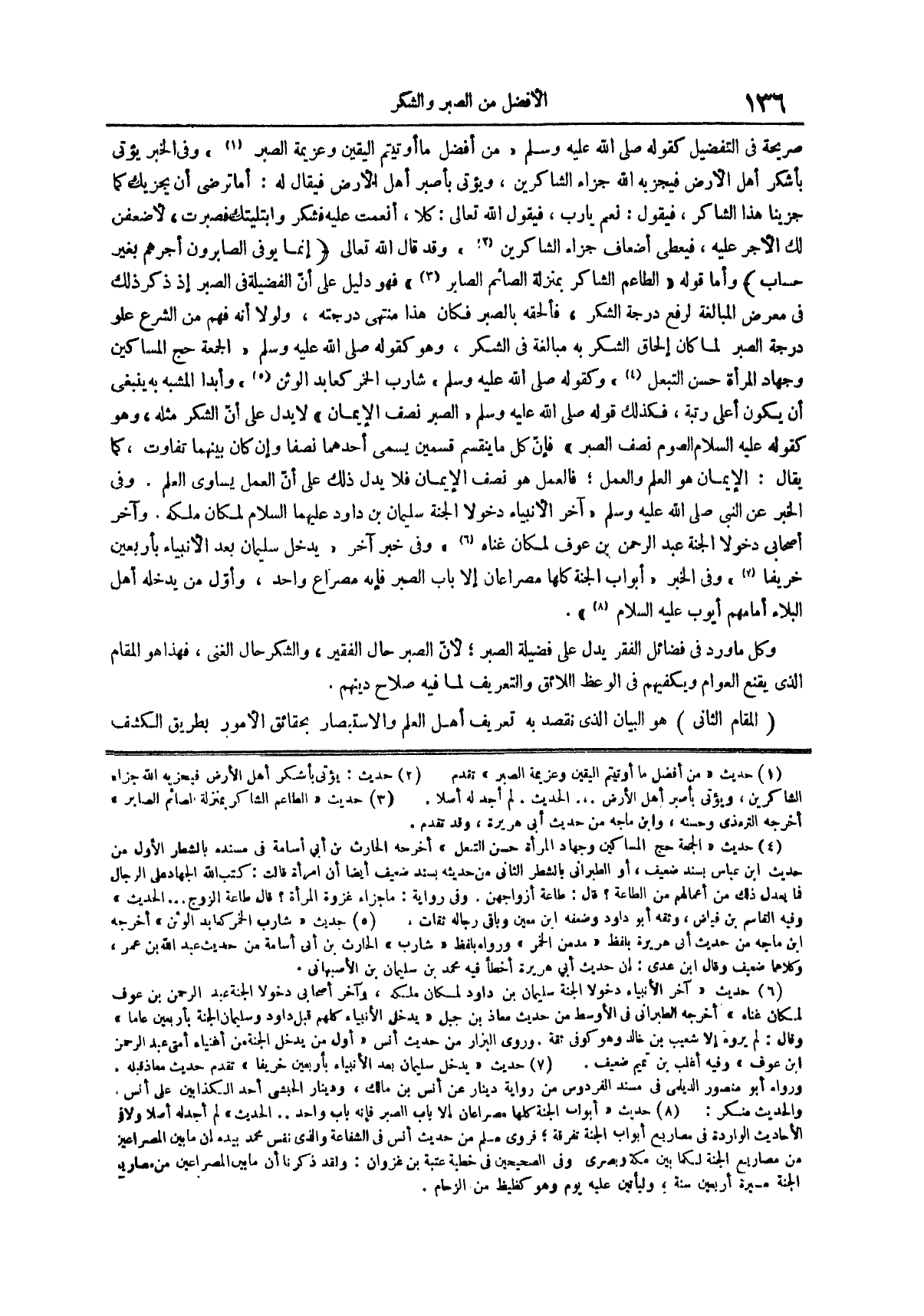 (¬5) وأبداً المشبه به ينبغي أن يكون أعلى رتبة فكذلك قَوْلُهُ صَلَّى اللَّهُ عَلَيْهِ وَسَلَّمَ الصَّبْرُ نِصْفُ الإيمان لا يدل على أن الشكر مثله وهو كقوله صَلَّى اللَّهُ عَلَيْهِ وَسَلَّمَ الصَّوْمُ نِصْفُ الصَّبْرِ فإن كل ما ينقسم قسمين يسمى أحدهما نصفاً وإن كان بينهما تفاوت كما يقال الإيمان هو العلم والعمل فالعمل هو نصف الإيمان فلا يدل ذلك على أن العمل يساوي العلم