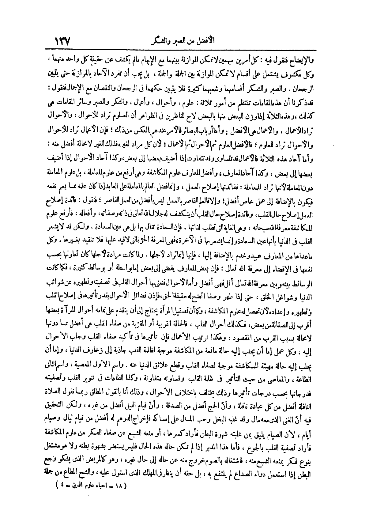 والصبر والشكر أقسامهما وشعبهما كثيرة فلا يتبين لحكمهما في الرجحان والنقصان مع الإجمال فنقول قد ذكرنا أن هذه المقامات تنتظم من أمور ثلاثة علوم وأحوال وأعمال والشكر والصبر وسائر المقامات هي كذلك وهى الثلاثة إذا وزن البعض منها بالبعض لاح للناظرين في الظواهر أن العلوم تراد للأحوال والأحوال تراد للأعمال والأعمال هي الأفضل وأما أرباب البصائر فالأمر عندهم بالعكس من ذلك فإن الأعمال تراد للأحوال والأحوال تراد للعلوم فالأفضل العلوم ثم الأحوال ثم الأعمال لأن كل مراد لغيره فذلك الغير لا محالة أفضل منه وأما آحاد هذه الثلاثة فالأعمال قد تتساوى وقد تتفاوت إذا أضيف بعضها إلى بعض وكذا آحاد الأحوال إذا أضيف بعضها إلى بعض وكذا آحاد المعارف وأفضل المعارف علوم المكاشفة وهي أرفع من علوم المعاملة بل علوم المعاملة دون المعاملة لأنها تراد المعاملة ففائدتها إصلاح العمل وإنما فضل العالم بالمعاملة على العابد إذا كان علمه مما يعم نفعه فيكون بالإضافة إلى عمل خاص أفضل وإلا فالعلم القاصر بالعمل ليس بأفضل من العمل القاصر فنقول فائدة إصلاح العمل إصلاح حال القلب وفائدة إصلاح حال القلب أن ينكشف له جلال الله تعالى في ذاته وصفاته وأفعاله فأرفع علوم المكاشفة معرفة الله سبحانه وهي الغاية التي تطلب لذاتها فإن السعادة تنال بها بل هي عين السعادة ولكن قد لا يشعر القلب في الدنيا بأنها عين السعادة وإنما يشعر بها في الآخرة فهي المعرفة الحرة التي لا قيد عليها فلا تتقيد بغيرها