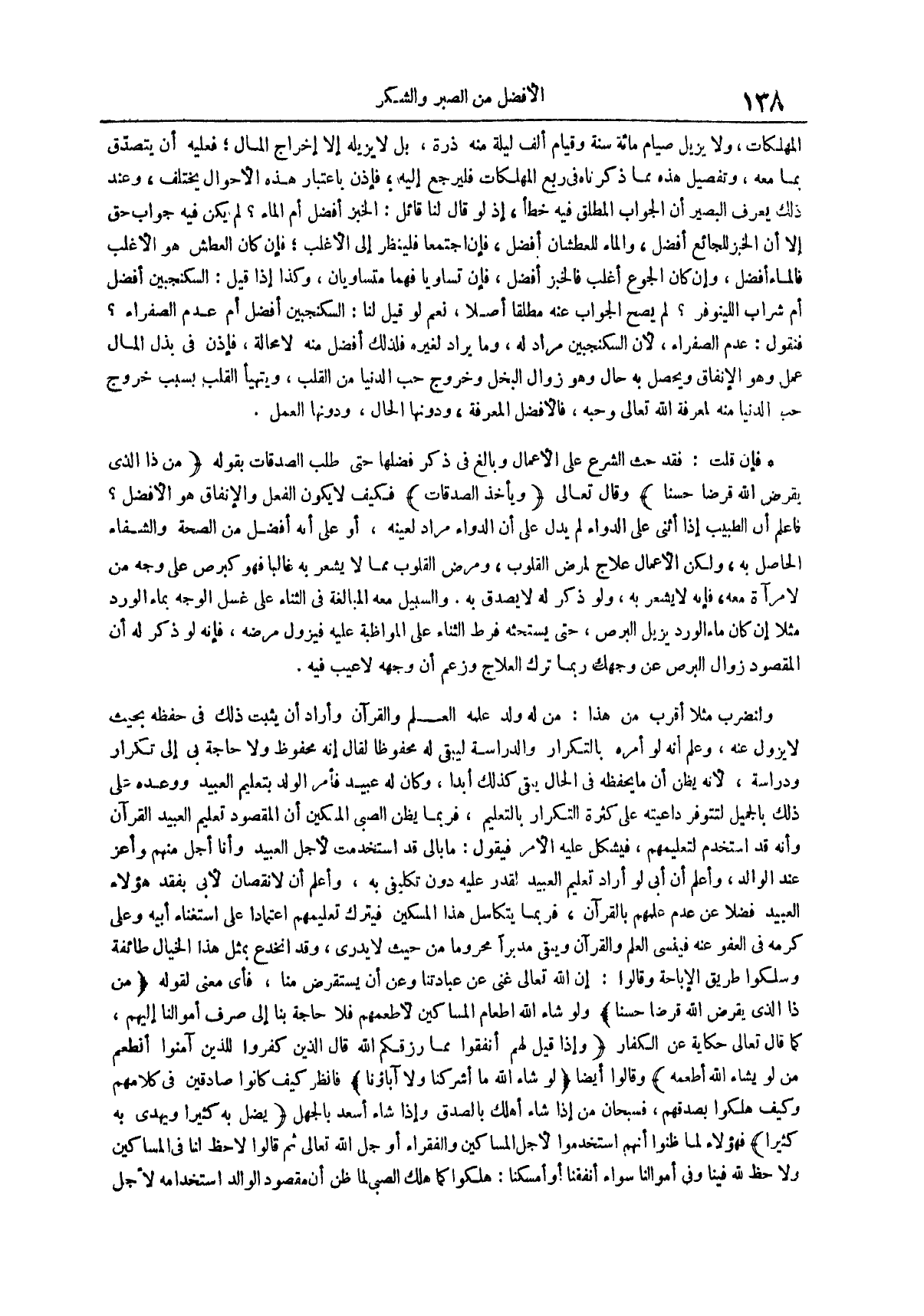 فإن قلت فقد حث الشرع على الأعمال وبالغ في ذكر فضلها حتى طلب الصدقات بقوله {من ذا الذي يقرض الله قرضاً حسناً} وقال تعالى {ويأخذ الصدقات} فكيف لا يكون الفعل والإنفاق هو الأفضل فاعلم أن الطبيب إذا أثنى على الدواء لم يدل على أن الدواء مراد لعينه أو على أنه أفضل من الصحة والشفاء الحاصل به ولكن الأعمال علاج لمرض القلوب ومرض القلوب مما لا يشعر به غالباً فهو كبرص على وجه من لا مرآة معه فإنه لا يشعر به ولو ذكر له لا يصدق به