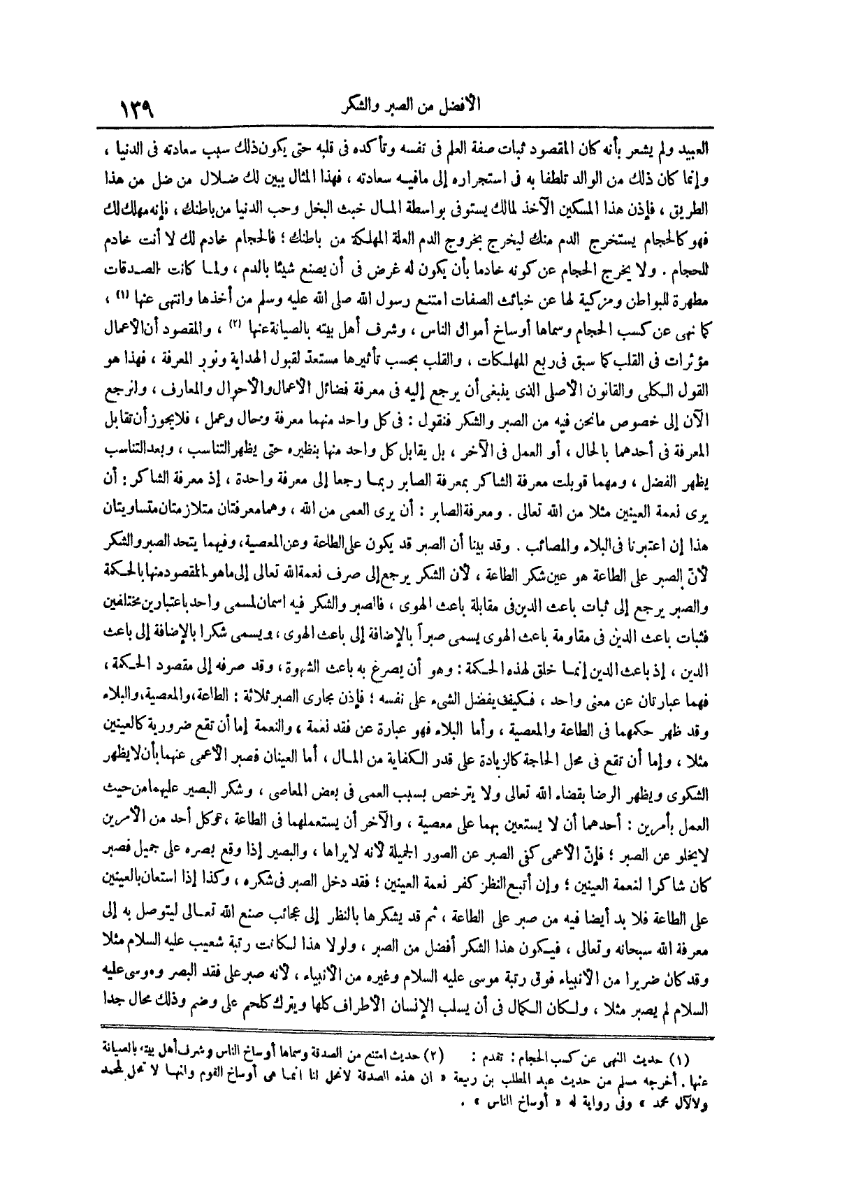 ولا يخرج الحجام عن كونه خادماً بأن يكون له غرض في أن يصنع شيئاً بالدم ولما كانت الصدقات مطهرة للبواطن ومزكية لها عن خبائث الصفات امتنع رسول الله صلى الله عليه وسلم من أخذها وانتهى عنها (¬1) كما نهى عن كسب الحجام وسماها أوساخ أموال الناس وشرف أهل بيته بالصيانة عنها (¬2) والمقصود أن الأعمال مؤثرات في القلب كما سبق في ربع المهلكات والقلب بحسب تأثيرها مستعد لقبول الهداية ونور المعرفة فهذا هو القول الكلي والقانون الأصلي الذي ينبغي أن يرجع إليه في معرفة فضائل الأعمال والأحوال والمعارف ولنرجع الآن إلى خصوص ما نحن فيه من الصبر والشكر فنقول في كل واحد منهما معرفة وحال وعمل فلا يجوز أن تقابل المعرفة في أحدهما بالحال أو العمل في الآخر بل يقابل كل واحد منهما بنظيره حتى يظهر التناسب وبعد التناسب يظهر الفضل ومهما قوبلت معرفة الشاكر بمعرفة الصابر ربما رجعا إلى معرفة واحدة إذ معرفة الشاكر أن يرى نعمة العينين مثلاً من الله تعالى