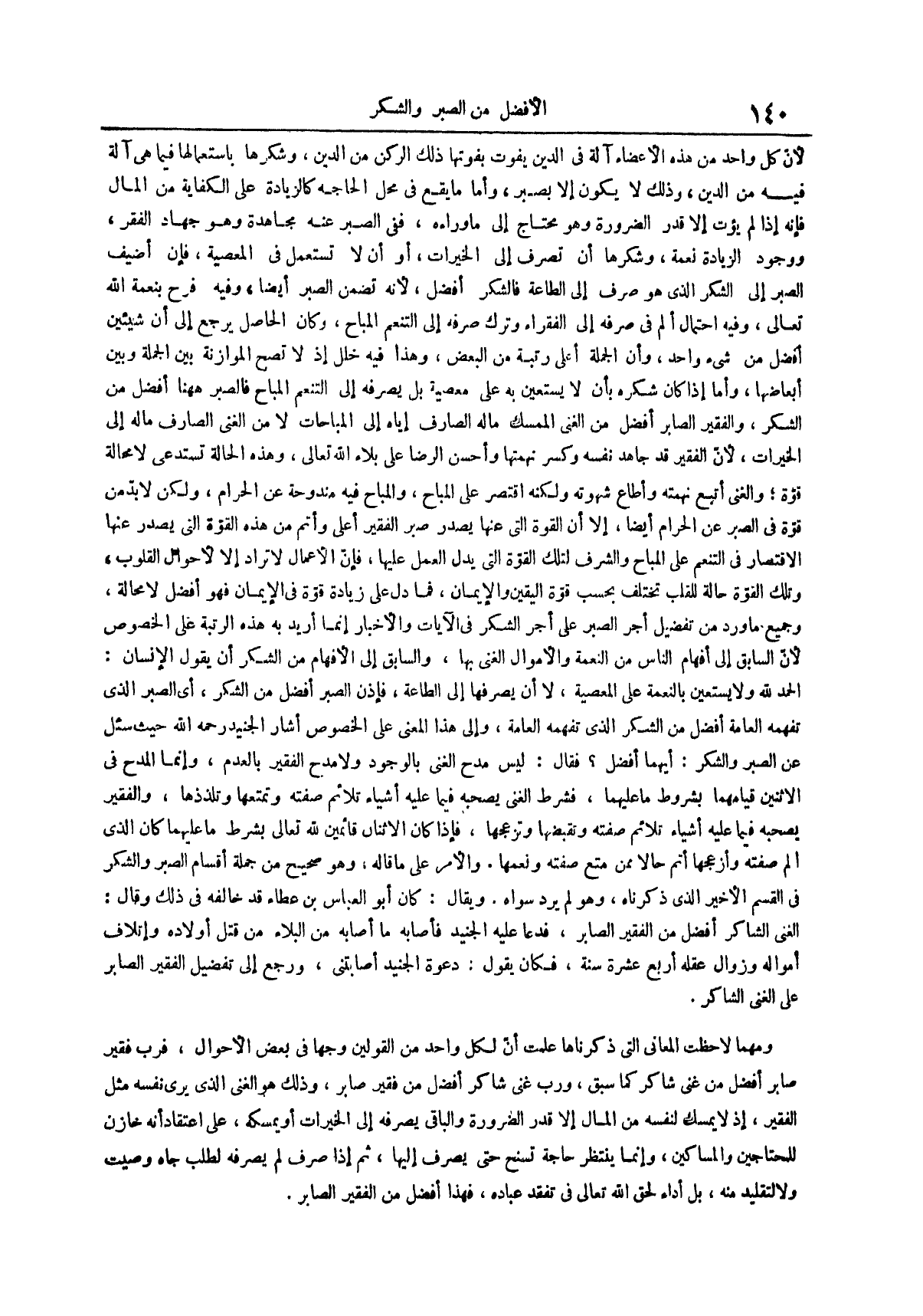 لأن كل واحد من هذه الأعضاء آلة في الدين يفوت بفوتها ذلك الركن من الدين وشكرها بإستعمالها فما هي آلة فيه من الدين وذلك لا يكون إلا بصبر وأما ما يقع في محل الحاجة كالزيادة على الكفاية من المال فإنه إذا لم يؤت إلا قدر الضرورة وهو محتاج إلى ما وراءه ففي الصبر عنه مجاهدة وهو جهاد الفقر ووجود الزيادة نعمة وشكرها أن تصرف إلى الخيرات أو أن لا تستعمل في المعصية فإن أضيف الصبر إلى الشكر الذي هو صرف إلى الطاعة فالشكر أفضل لأنه تضمن الصبر أيضاً وفيه فرح بنعمة الله تعالى وفيه احتمال ألم في صرفه إلى الفقراء وترك صرفه إلى التنعم المباح وكان الحاصل يرجع إلى أن شيئين أفضل من شيء واحد وأن الجملة أعلى رتبة من البعض وهذا فيه خلل إذ لاتصح الموازنة بين الجملة وبين أبعاضها وأما إذا كان شكره بأن لا يستعيين به على معصية بل يصرفه إلى التنعم المباح فالصبر ههنا أفضل من الشكر والفقير الصابر أفضل من الغني الممسك ماله الصارف إياه إلى المباحات لا من الغني الصارف ماله إلى الخيرات لأن الفقير قد جاهد نفسه وكسر نهمتها وأحسن الرضا على بلاء الله تعالى وهذه الحالة تستدعي لا محالة قوة والغني أتبع نهمته وأطاع شهوته ولكنه اقتصر على المباح والمباح فيه مندوحة عن الحرام ولكن لا بد من قوة في الصبر عن الحرام أيضاً إلا أن القوة التي عنها يصدر صبر الفقير أعلى وأتم من هذه القوة التي يصدر عنها الاقتصار في التنعم على المباح والشرف لتلك القوة التي يدل العمل عليها فإن الأعمال لا تراد إلا الأحوال القلوب وتلك القوة حالة للقلب تختلف بحسب قوة اليقين والإيمان فما دل على زيادة قوة في الإيمان فهو أفضل لا محالة وجميع ما ورد من تفضيل أجر الصبر على أجر الشكر في الآيات والأخبار إنما أريد به هذه الرتبة على الخصوص لأن السابق إلى أفهام الناس من النعمة والأموال الغنى بها والسابق إلى الأفهام من الشكر أن يقول الإنسان الحمد لله ولا يستعين بالنعمة على المعصية لا أن يصرفها إلى الطاعة فإذن الصبر أفضل من الشكر أي الصبر الذي تفهمه العامة أفضل من الشكر الذي تفهمه العامة وإلى هذا المعنى على الخصوص أشار الجنيد رحمه الله حيث سئل عن الصبر والشكر أيهما أفضل فقال ليس مدح الغني بالوجود ولا مدح الفقير بالعدم وإنما المدح في الاثنين قيامهما بشروط ما عليهما فشرط الغنى يصحبه فيما عليه أشياء تلائم صفته وتمتعها وتلذذها والفقير يصحبه فيما عليه أشياء تلائم صفته وتقبضها وتزعجها فإذا كان الاثنان قائمين لله تعالى بشرط ما عليهما كان الذي ألم صفته وأزعجها أتم حالاً ممن متع صفته ونعمها
