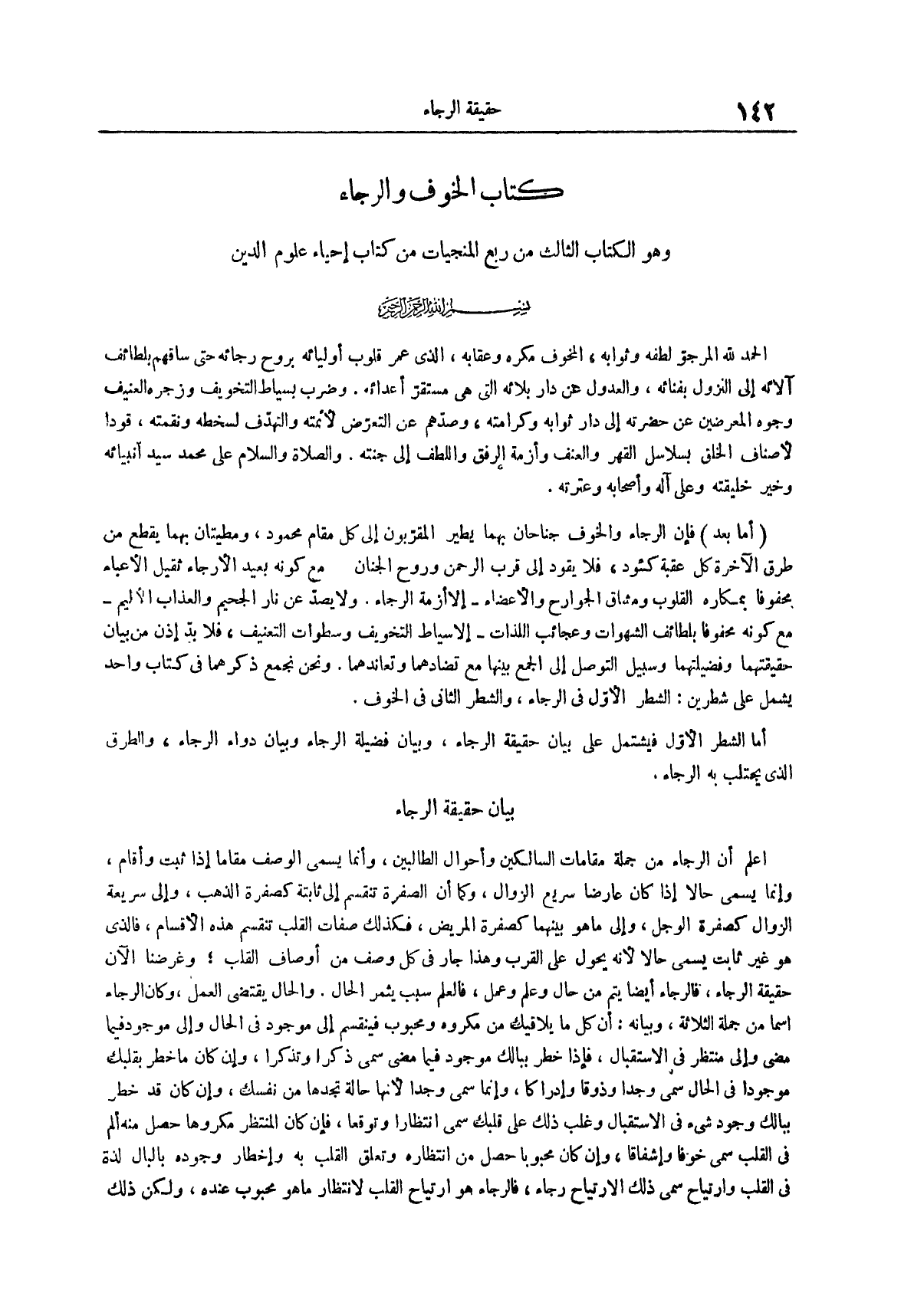 أما بعد فإن الرَّجَاءُ وَالْخَوْفُ جَنَاحَانِ بِهِمَا يَطِيرُ الْمُقَرَّبُونَ إِلَى كُلِّ مَقَامٍ مَحْمُودٍ وَمَطِيَّتَانِ بِهِمَا يَقْطَعُ مِنْ طرق الآخرة كل عقبة كسود فلا يقود إلى قرب الرحمن وروح الجنان مع كونه بعيد الأرجاء ثقيل الأعباء مجفوفا بمكاره القلوب ومشاق الجوارح والأعضاء إِلَّا أَزِمَّةُ الرَّجَاءِ وَلَا يَصُدُّ عَنْ نَارِ الجحيم والعذاب الأليم مع كونه محفوفاً بلطائف الشهوات وعجائب اللذات إلا سياط التخويف وسطوات التعنيف فلا بد إذن من بيان حقيقتهما وفضيلتهما وسبيل التوصيل إلى الجمع بينها مع تضادهما وتعاندهما ونحن نجمع ذكرهما في كتاب واحد يشمل على شطرين الشطر الأول في الرجاء والشطر الثانى في الخوف