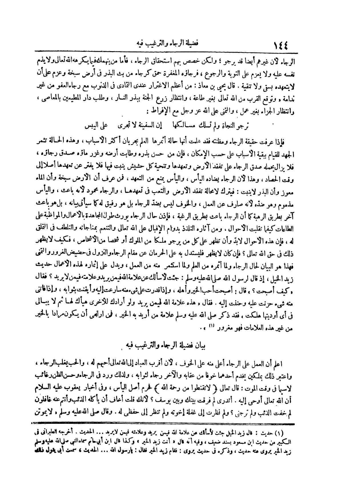 فإذا عرفت حقيقة الرجاء ومظنته فقد علمت أنها حالة أثمرها العلم بجريان أكثر الأسباب وهذه الحالة تثمر الجهد للقيام ببقية الأسباب على حسب الإمكان فإن من حسن بذره وطابت أرضه وغزر ماؤه صدق رجاؤه فلا يزال يحمله صدق الرجاء على تفقد الأرض وتعهدها وتنحية كل حشيش ينبت فيها فلا يفتر عن تعهدها أصلاً إلى وقت الحصاد وهذا لأن الرجاء يضاده اليأس واليأس يمنع من التعهد فمن عرف أن الأرض سبخة وأن الماء معوز وأن البذر لا ينبت فيترك لا محالة تفقد الأرض والتعب في تعهدها والرجاء محمود لأنه باعث واليأس مذموم وهو ضده لأنه صارف عن العمل والخوف ليس بضد للرجاء بل هو رفيق له كما سيأتي بيانه بل هو باعث آخر بطريق الرهبة كما أن الرجاء باعث بطريق الرغبة فَإِذَنْ حَالُ الرَّجَاءِ يُورِثُ طُولَ الْمُجَاهَدَةِ بِالْأَعْمَالِ وَالْمُوَاظَبَةِ عَلَى الطَّاعَاتِ كَيْفَمَا تَقَلَّبَتِ الْأَحْوَالُ وَمِنْ آثَارِهِ التَّلَذُّذُ بِدَوَامِ الْإِقْبَالِ عَلَى اللَّهِ تَعَالَى والتنعم بمناجاته وَالتَّلَطُّفُ فِي التَّمَلُّقِ لَهُ فَإِنَّ هَذِهِ الْأَحْوَالَ لابد وَأَنْ تَظْهَرَ عَلَى كُلِّ مَنْ يَرْجُو مَلِكًا مِنَ الْمُلُوكِ أَوْ شَخْصًا مِنَ الْأَشْخَاصِ فَكَيْفَ لَا يَظْهَرُ ذَلِكَ فِي حَقِّ اللَّهِ تَعَالَى فَإِنْ كَانَ لَا يَظْهَرُ فَلْيُسْتَدَلَّ بِهِ عَلَى الْحِرْمَانِ عَنْ مَقَامِ الرَّجَاءِ وَالنُّزُولِ فِي حَضِيضِ الغرور والتمني فهذا هو البيان لحال الرجاء ولما أثمره من العلم ولما استثمر منه من العمل ويدل على إثماره لهذه الأعمال حديث زيد الخيل إذ قَالَ لِرَسُولِ اللَّهِ صَلَّى اللَّهُ عَلَيْهِ وَسَلَّمَ جئت لأسألك عن علامة الله فيمن لا يريد وعلامته فيمن لا يريد فقال كيف أصبحت قال أصحبت أحب الخير وأهله وإذا قدرت على شيء منه سارعت إليه وأيقنت بثوابه وإذا فاتني منه شيىء حزنت عليه وحننت إليه