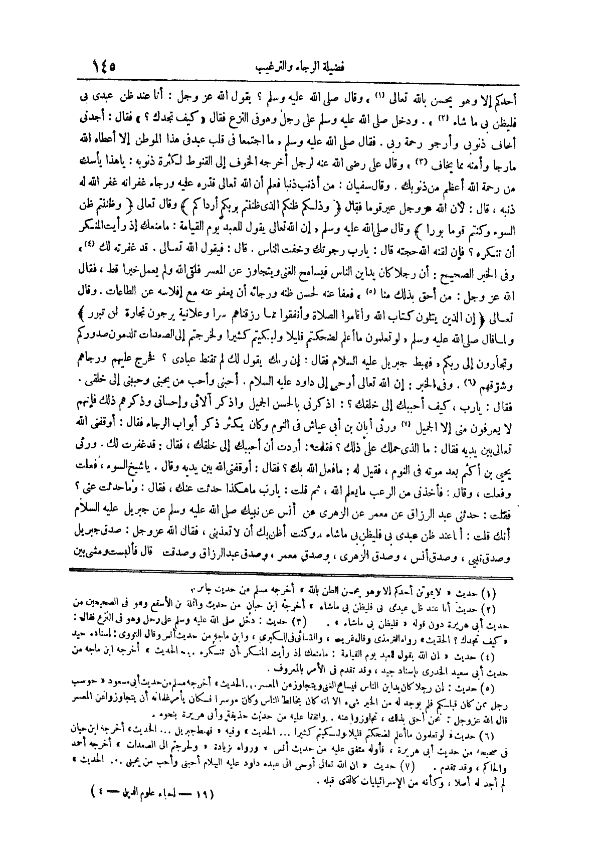 وقال سفيان من أذنب ذنباً فعلم أن الله تعالى قدره عليه ورجاء غفرانه غفر الله له ذنبه قال لأن الله عز وجل عير قوماً فقال وذلكم ظنكم الذي ظننتم بربكم أرداكم وقال تعالى وظننتم ظن السوء وكنتم قوماً بوراً وَقَالَ صَلَّى اللَّهُ عَلَيْهِ وَسَلَّمَ إِنَّ اللَّهَ تعالى يقول للعبد يوم القيامة ما منعك إذ رأيت المنكر أن تنكره فإن لقنه الله حجته قال يا رب رجوتك وخفت الناس قال فيقول الله تعالى قد غفرته لك (¬4) وفي الخبر الصحيح أن رجلاً كان يداين الناس فيسامح الغني ويتجاوز عن المعسر فلقي الله ولم يعمل خيراً قط فقال الله عز وجل من أحق بذلك منا (¬5) فعفا عنه لحسن ظنه ورجائه أن يعفو عنه مع إفلاسه عن الطاعات وَقَالَ تَعَالَى إِنَّ الَّذِينَ يَتْلُونَ كِتَابَ اللَّهِ وَأَقَامُوا الصَّلَاةَ وَأَنْفَقُوا مِمَّا رَزَقْنَاهُمْ سِرًّا وَعَلَانِيَةً يرجون تجارة لن تبور ولما قال صلى الله عليه وسلم لو تعلمون ما أعلم لضحكتم قليلاً ولبكيتم كثيراً ولخرجتم إلى الصعدات تلدمون صدروكم وتجأرون إلى ربكم فهبط جبريل عليه السلام فقال إن ربك يقول لك لم تقنط عبادي فخرج عليهم ورجاهم وشوقهم (¬6)