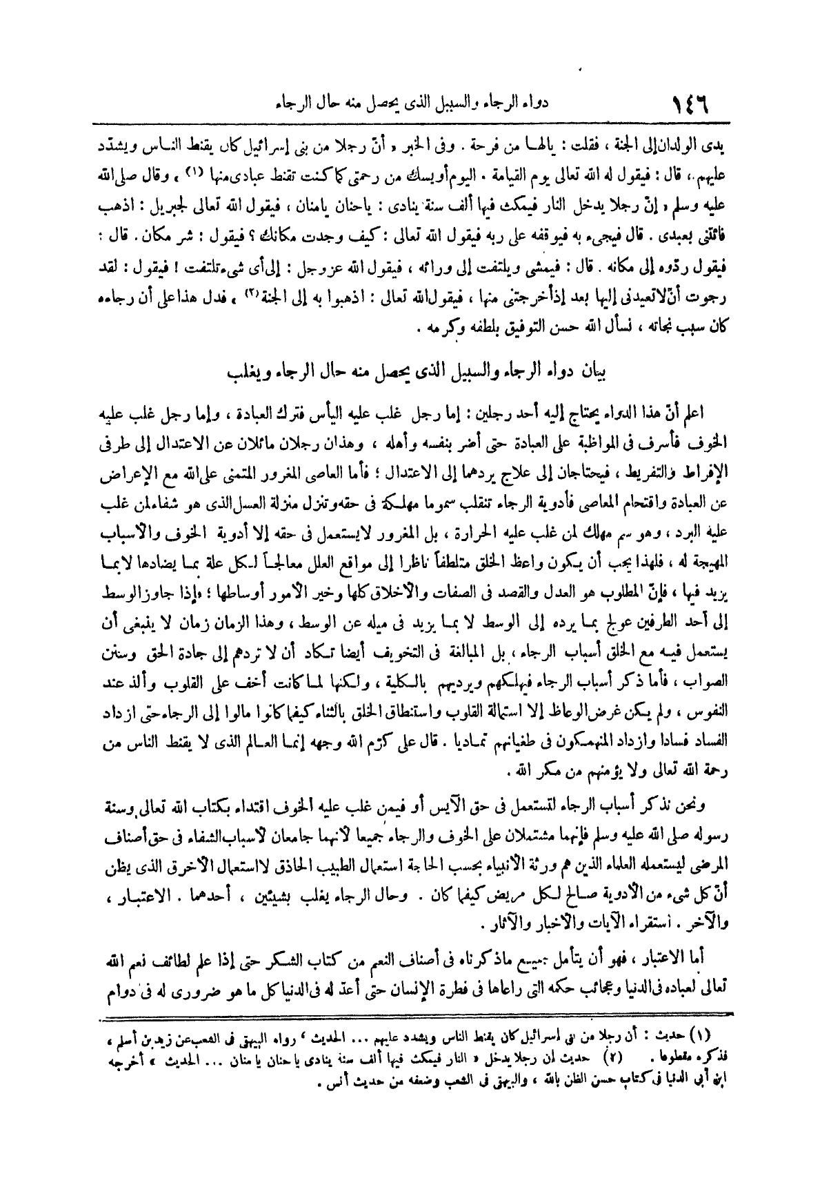 ونحن نذكر اساب الرجاء لتستعمل في حق الآيس أو فيمن غلب عليه الخوف اقتداءً بكتاب اللَّهِ تَعَالَى وَسُنَّةِ رَسُولِهِ صَلَّى اللَّهُ عَلَيْهِ وسلم فإنهما مشتملان على الخوف والرجاء جميعاً لأنهما جامعان لأسباب الشفاء في حق أصناف المرضى ليستعمله العلماء الذين هم ورثة الأنبياء بحسب الحاجة استعمال الطبيب الحاذق لا استعمال الأخرق الذي يظن أن كل شيى من الأدوية صالح لكل مريض كيفما كان