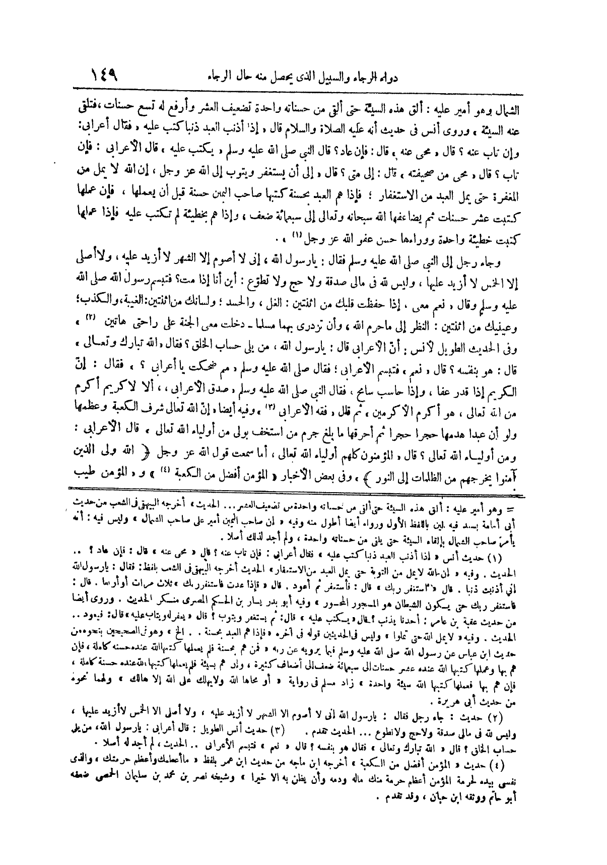 (¬1) حديث أنس إذا أذنب العبد ذنباً كتب عليه فقال أعرابي فإن تاب عنه قال محي عنه قال فإن عاد الحديث وفيه إن الله لا يمل من التوبة حتى يمل العبد من الإستغفار الحديث أخرجه البيهقي في الشعب بلفظ فقال يا رسول الله إني أذنبت ذنبا قال استغفر ربك قال فاستغفر ثم أعود قال فإذا عدت فاستغفر ربك ثلاث مرات أو أربعا قال فاستغفر ربك حتى يكون الشيطان هو المسجور المحسور وفيه أبو بدر يسار بن الحكم المصري منكر الحديث وروى أيضا من حديث عقبة بن عامر أحدنا يذنب قال يكتب عليه قال ثم يستغفر ويتوب قال يغفر له ويتاب عليه قال فيعود الحديث وفيه لا يمل الله حتى تملوا وليس في الحديثين قوله في آخره فإذا هم العبد بحسنة الخ وهو في الصحيحين بنحوه من حديث ابْنُ عَبَّاسٍ عَنْ رَسُولِ اللَّهِ صَلَّى اللَّهُ عليه وسلم فيما يرويه عن ربه فمن هم بحسنة فلم يعملها كتبها الله عنده حسنة كاملة فإن هم بها وعملها كتبها الله عنده عشر حسنات إلى سبعمائة ضعف إلى أضعاف كثيرة وإن هم بسيئة فلم يعملها كتبها الله عنده حسنة كاملة فإن هم بها فعملها كتبها الله سيئة واحدة زاد مسلم في رواية أو محاها الله ولا يهلك على الله إلا هالك ولهما نحوه من حديث أبي هريرة