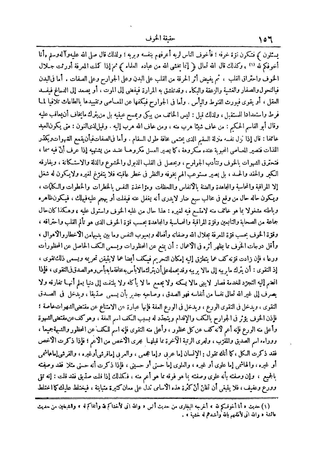 فتكون قُوَّةُ خَوْفِهِ فَأَخْوَفُ النَّاسِ لِرَبِّهِ أَعْرَفُهُمْ بِنَفْسِهِ وَبِرَبِّهِ وَلِذَلِكَ قَالَ صَلَّى اللَّهُ عَلَيْهِ وَسَلَّمَ أَنَا أَخْوَفُكُمُ لِلَّهِ (¬1) وَكَذَلِكَ قَالَ اللَّهُ تَعَالَى {إنما يخشى الله من عباده العلماء} ثُمَّ إِذَا كَمُلَتِ الْمَعْرِفَةُ أَوْرَثَتْ جَلَالَ الْخَوْفِ وَاحْتِرَاقَ الْقَلْبِ ثُمَّ يَفِيضُ أَثَرُ الْحُرْقَةِ مِنَ القلب على البدن وعلى الجوارج وعلى الصفات