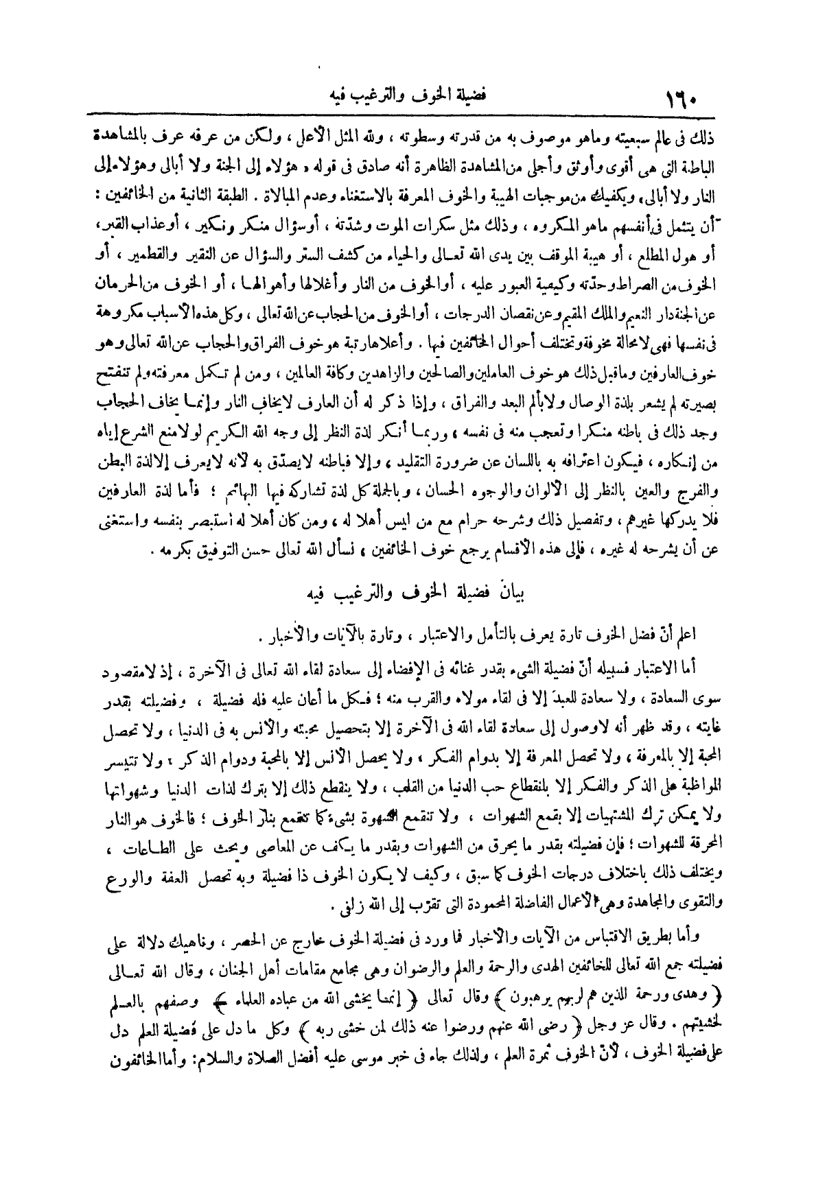 ذلك في عالم سبعيته وما هو موصوف به من قدرته وسطوته ولله المثل الأعلى ولكن من عرفه عرف بالمشاهدة الباطنة التي هي أقوى وأوثق وأجلى من المشاهدة الظاهرة أنه صادق في قوله هؤلاء إلى الجنة ولا أبالي وهؤلاء إلى النار ولا أبالي ويكفيك من موجبات الهيبة والخوف المعرفة بالاستغناء وعدم المبالاة الطبقة الثانية من الخائفين أن يتمثل في أنفسهم ما هو المكروه وذلك مثل سكرات الموت وشدته أو سؤال منكر ونكير أو عذاب القبر أو هول المطلع أو هيبة الموقف بين يدي الله تعالى والحياء من كشف الستر والسؤال عن النقير والقطمير أو الخوف من الصراط وحدته وكيفية العبور عليه أو الخوف من النار وأغلالها وأهوالها أو الخوف من الحرمان عن الجنة دار النعيم والملك المقيم وعن نقصان الدرجات أو الخوف من الحجاب عن الله تعالى وكل هذه الأسباب مكروهة في نفسها فهي لا محالة مخوفة تختلف أحوال الخائفين فيها