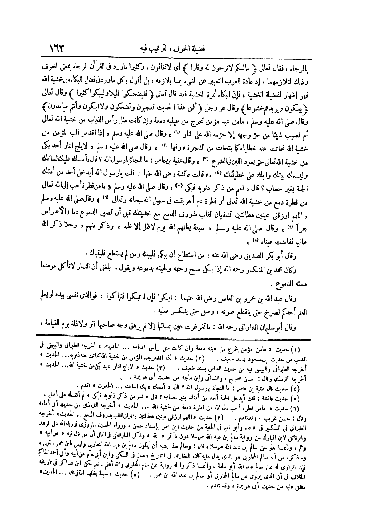 (¬2) حديث لا يلج النار عبد بكى من خشية الله الحديث أخرجه الترمذي وقال حسن صحيح والنسائي وابن ماجه من حديث أبي هريرة