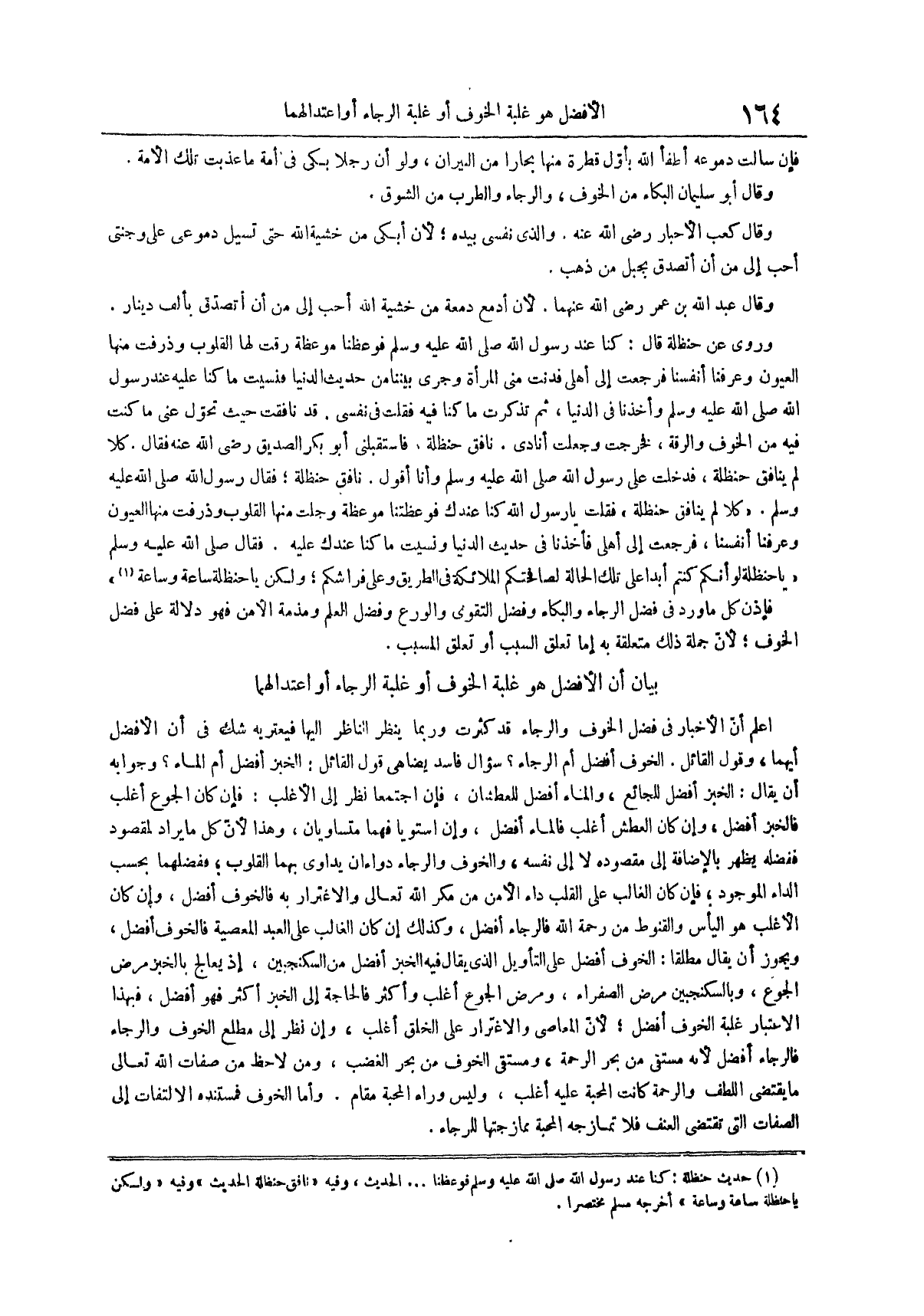 فإذن كل ما ورد في فضل الرجاء والبكاء وفضل التقوى والورع وفضل العلم ومذمة الأمن فهو دلالة على فضل الخوف لأن جملة ذلك متعلقة به إما تعلق السبب أو تعلق المسبب