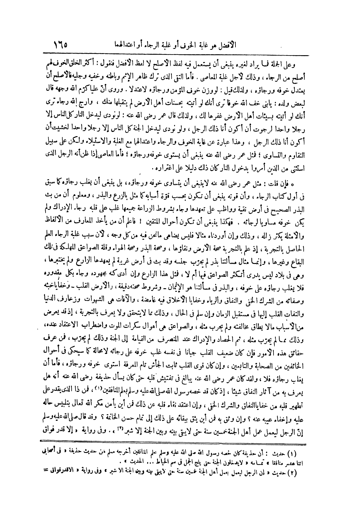 فإن قلت مثل عمر رضي الله عنه لا ينبغي أن يتساوى خوفه ورجاؤه بل ينبغي أن يغلب رجاؤه كما سبق في أول كتاب الرجاء وأن قوته ينبغي أن تكون بحسب قوة أسبابه كما مثل بالزرع والبذر ومعلوم أن من بث البذر الصحيح في أرض نقية وواظب على تعهدها وجاء بشروط الزراعة جميعها غلب على قلبه رجاء الإدراك ولم يكن خوفه مساوياً لرجائه فهكذا ينبغي أن تكون أحوال المتقين فاعلم أن من يأخذ المعارف من الألفاظ والأمثلة يكثر زلله وذلك وإن أوردناه مثالاً فليس يضاهي ما نحن فيه من كل وجه لأن سبب غلبة الرجاء العلم الحاصل بالتجربة إذ علم بالتجربة صحة الأرض ونقاؤها وصحة البذر وصحة الهواء وقلة الصواعق المهلكة في تلك البقاع وغيرها وإنما مثال مسألتنا بذر لم يجرب جنسه وقد بث في أرض غريبة لم يعهدها الزارع ولم يختبرها وهي في بلاد ليس يدري أتكثر الصواعق فيها أم لا فمثل هذا الزارع وإن أدى كنه مجهوده وجاء بكل مقدوره فلا يغلب رجاؤه على خوفه والبذر في مسألتنا هو الإيمان وشروطه صحته دقيقة والأرض القلب وخفايا خبثه وصفائه من الشرك الخفي والنفاق والرياء وخفايا الأخلاق فيه غامضة والآفات هي الشهوات وزخارف الدنيا والتفات القلب إليها في مستقبل الزمان وإن سلم في الحال وذلك مما لا يتحقق ولا يعرف بالتجربة إذ قد تعرض من الأسباب ما لا يطاق مخالفته ولم يجرب مثله والصواعق هي أهوال سكرات الموت واضطراب الاعتقاد عنده وذلك مما لم يجرب مثله ثم الحصاد والإدراك عند المنصرف من القيامة إلى الجنة وذلك لم يجرب فمن عرف حقائق هذه الأمور فإن كان ضعيف القلب جباناً في نفسه غلب خوفه على رجائه لا محالة كما سيحكى في أحوال الخائفين من الصحابة والتابعين وإن كان قوي القلب ثابت الجأش تام المعرفة استوى خوفه ورجاؤه فأما أن يغلب رجاؤه فلا ولقد كان عمر رضي الله عنه يبالغ في تفتيش قلبه حتى كان يسأل حذيفة رضي الله عنه أنه هل يعرف به من آثار النفاق شيئاً إذ كان قد خصه رسول الله صلى الله عليه وسلم بعلم المنافقين (¬1)