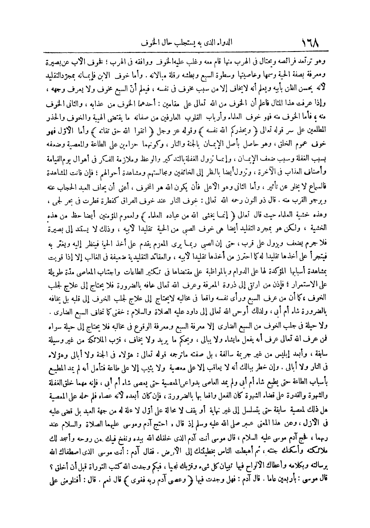 قال ذو النون رحمه الله تعالى خوف النار عند خوف الفراق كقطرة قطرت في بحر لجي وهذه خشية العلماء حيث قَالَ تَعَالَى إِنَّمَا يَخْشَى اللَّهَ مِنْ عِبَادِهِ العلماء ولعموم المؤمنين أيضاً حظ من هذه الخشية ولكن هو بمجرد التقليد أيضا هي خوف الصبي من الحية تقليداً لأبيه وذلك لا يستند إلى بصيرة فلا جرم يضعف ويزول على قرب حتى إن الصبي ربما يرى المعزم يقدم على أخذ الحية فينظر إليه ويغتر به فيتجرأ على أخذها تقليداً له كما احترز من أخذها تقليداً لأبيه والعقائد التقليدية ضعيفة في الغالب إلا إذا قويت بمشاهدة أسبابها المؤكدة لها على الدوام وبالمواظبة على مقتضاها في تكثير الطاعات واجتناب المعاصي مدة طويلة على الاستمرار فإذن من ارتقى إلى ذروة المعرفة وعرف الله تعالى خافه بالضرورة فلا يحتاج إلى علاج لجلب الخوف كما أن من عرف السبع ورأى نفسه واقعاً في مخالبه لا يحتاج إلى علاج لجلب الخوف إلى قلبه بل يخافه بالضرورة شاء أم أبى ولذلك أوحى الله تعالى إلى داود عليه الصلاة والسلام خفني كما تخاف السبع الضاري
