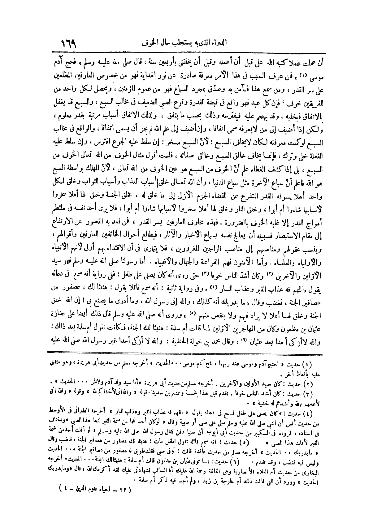 فمن عرف السبب في هذا الأمر معرفة صادرة عن نور الهداية فهو من خصوص العارفين المطلعين على سر القدر ومن سمع هذا فآمن به وصدق بمجرد السماع فهو من عموم المؤمنين ويحصل لكل واحد من الفريقين خوف فإن كان عبد فهو واقع في قبضة القدرة وقوع الصبي الضعيف في مخالب السبع والسبع قد يغفل بالاتفاق فيخليه وقد يهجم عليه فيفترسه وذلك بحسب ما يتفق ولذلك الاتفاق أسباب مرتبة بقدر معلوم ولكن إذا أضيف إلى من لا يعرفه سمي اتفاقاً وإن أضيف إلى علم الله لم يجز أن يسمى اتفاقاً والواقع في مخالب السبع لو كملت معرفته لكان لا يخاف السبع لأن السبع مسخر إن سلط عليه الجوع افترس وإن سلط عليه الغفلة خلى وترك فإنما يخاف خالق السبع وخالق صفاته فلست أقول مثال الخوف من الله تعالى الخوف من السبع بل إذا كشف الغطاء علم أن الخوف من السبع هو عين الخوف من الله تعالى لأن المهلك بواسطة السبع هو الله فاعلم أن سباع الآخرة مثل سباع الدنيا وأن الله تعالى خلق أسباب العذاب وأسباب الثواب وخلق لكل واحد أهلاً يسوقه القدر المتفرع عن القضاء الجزم الأزلي إلى ما خلق له فخلق الجنة وخلق لها أهلاً سخروا لأسبابها شاءوا أم أبوا وخلق النار وخلق لها أهلاً سخروا لأسبابها شاءوا أم أبوا فلا يرى أحد نفسه في ملتطم أمواج القدر إلا غلبه الخوف بالضرورة فهذه مخاوف العارفين بسر القدر فمن قعد به الْقُصُورِ عَنِ الِارْتِفَاعِ إِلَى مَقَامِ الِاسْتِبْصَارِ فَسَبِيلُهُ أَنْ يُعَالِجَ نَفْسَهُ بِسَمَاعِ الْأَخْبَارِ وَالْآثَارِ فَيُطَالِعَ أحوال الخائفين العارفين وَأَقْوَالَهُمْ وَيَنْسُبَ عُقُولَهُمْ وَمَنَاصِبَهُمْ إِلَى مَنَاصِبِ الرَّاجِينَ الْمَغْرُورِينَ فَلَا يَتَمَارَى فِي أَنَّ الِاقْتِدَاءَ بِهِمْ أَوْلَى لِأَنَّهُمُ الْأَنْبِيَاءُ وَالْأَوْلِيَاءُ وَالْعُلَمَاءُ