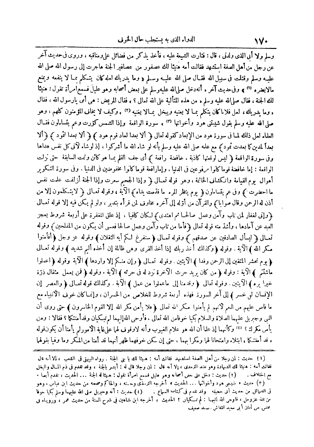 وفي سورة التكوير أهوال يوم القيامة وانكشاف الخاتمة وهو قوله تعالى وإذا الجحيم سعرت وإذا الجنة أزلفت علمت نفس ما أحضرت وفي عم يتساءلون يوم ينظر المرء ما قدمت يداه الآية وقوله تعالى لا يتكلمون إلا من أذن له الرحمن وقال صوابا والقرآن من أوله إلى آخره مخاوف لمن قرأه بتدبر ولو لم يكن فيه إلا قوله تعالى وإني لغفار لمن تاب وآمن وعمل صالحا ثم اهتدى لكان كافيا إذ علق المغفرة على أربعة شروط يعجز العبد عن آحادها وأشد منه قوله تعالى فأما من تاب وآمن وعمل صالحا فعسى أن يكون من المفلحين وقوله تعالى ليسأل الصادقين عن صدقهم وقوله تعالى سنفرغ لكم أيه الثقلان وقوله عز وجل أفأمنوا مكر الله الآية