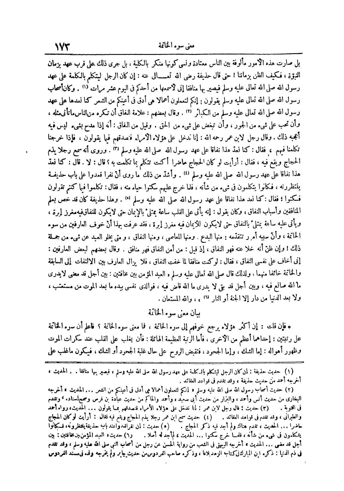 وهذا حذيفة كان قد خص بعلم المنافقين وأسباب النفاق وكان يقول إنه يأتي على القلب ساعة يمتلئ بالإيمان حتى لا يكون للنفاق فيه مغرز إبرة ويأتي عليه ساعة يمتلئ بالنفاق حتى لا يكون للأيمان فيه مغرز إبرة فقد عرفت بهذا أن خوف العارفين من سوء الخاتمة وأن سببه أمور تتقدمه منها البدع
