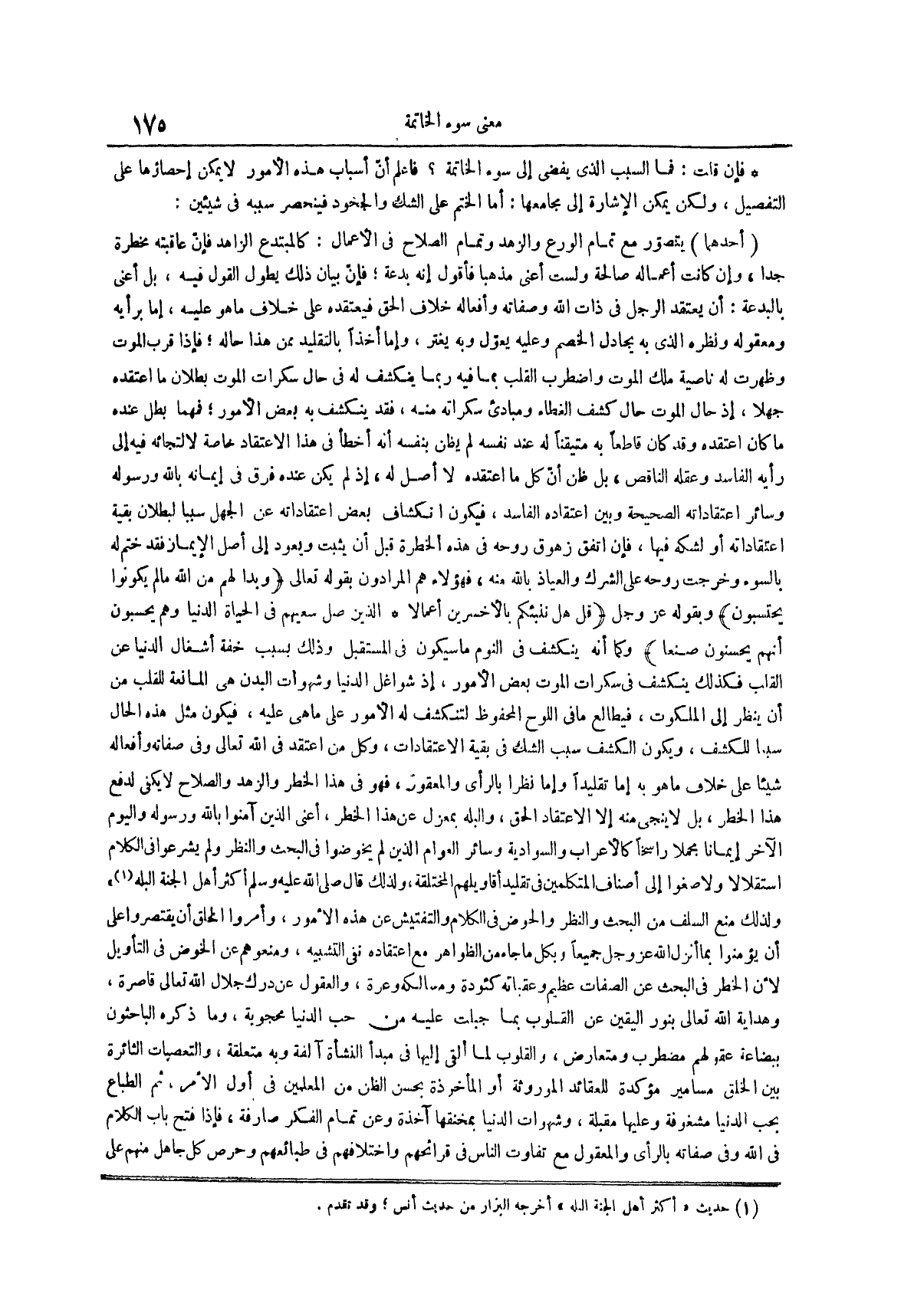 أحدهما يتصور مع تمام الورع والزهد وتمام الصلاح في الأعمال كالمبتدع الزاهد فإن عاقبته مخطرة جداً وإن كانت أعماله صالحة ولست أعني مذهباً فأقول إنه بدعة فإن بيان ذلك يطول القول فيه بل أعني بالبدعة أن يعتقد الرجل في ذات الله وصفاته وأفعاله خلاف الحق فيعتقده على خلاف ما هو عليه إما برأيه ومعقوله ونظره الذي به يجادل الخصم وعليه يعول وبه يغتر وإما أخذاً بالتقليد ممن هذا حاله فإذا قرب الموت وظهرت له ناصية ملك الموت واضطرب القلب بما فيه ربما ينكشف له في حال سكرات الموت بطلان ما اعتقده جهلاً إذ حال الموت حال كشف الغطاء ومبادىء سكراته منه فقد ينكشف به بعض الأمور فمهما بطل عنده ما كان اعتقده وقد كان قاطعاً به متيقنا له عند نفسه لم يظن بنفسه أنه أخطأ في هذا الاعتقاد خاصة لالتجائه فيه إلى رأيه الفاسد وعقله الناقص بل ظن أن كل ما اعتقده لا أصل له إذ لم يكن عنده فرق في إيمانه بالله ورسوله وسائر اعتقاداته الصحيحة وبين اعتقاده الفاسد فيكون انكشاف بعض اعتقاداته عن الجهل سبباً لبطلان بقية اعتقاداته أو لشكه فيها فإن اتفق زهوق روحه في هذه الخطرة قبل أن يثبت ويعود إلى أصل الإيمان فقد ختم له بالسوء وخرجت روحه على الشرك والعياذ بالله منه فهؤلاء هم المرادون بقوله تعالى وبدا لهم من الله ما لم يكونوا يحتسبون وبقوله عز وجل قل هل ننبئكم بالأخسرين أعمالاً الَّذِينَ ضَلَّ سَعْيُهُمْ فِي الْحَيَاةِ الدُّنْيَا وَهُمْ يحسبون أنهم يحسنون صنعاً وكما أنه ينكشف في النوم ما سيكون في المستقبل وذلك بسبب خفة أشغال الدنيا عن القلب فكذلك ينكشف في سكرات الموت بعض الأمور إذ شواغل الدنيا وشهوات البدن هي المانعة للقلب من أن ينظر إلى الملكوت فيطالع ما في اللوح المحفوظ لتنكشف له الأمور على ما هي عليه فيكون مثل هذه الحال سبباً للكشف ويكون الكشف سبب الشك في بقية الاعتقادات وكل من اعتقد في الله تعالى وفي صفاته وأفعاله شيئاً على خلاف ما هو به إما تقليداً وإما نظراً بالرأي والمعقون فهو في هذا الخطر والزهد والصلاح لا يكفي لدفع هذا الخطر بل لا ينجي منه إلا الاعتقاد الحق والبله بمعزل عن هذا الخطر أعني الذين آمنوا بالله ورسوله واليوم الآخر إيماناً مجملاً راسخاً كالأعراب والسوادية وسائر العوام الذين لم يخوضوا في البحث والنظر ولم يشرعوا في الكلام استقلالاً ولا صغوا إلى أصناف المتكلمين في تقليد أقاويلهم المختلفة ولذلك قال صلى الله عليه وسلم أكثر أهل الجنة البله (¬1)