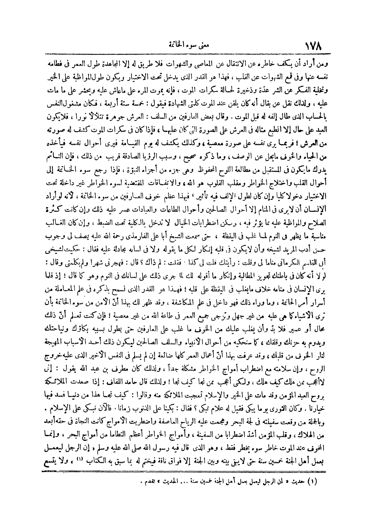 وقال بعض العارفين من السلف العرش جوهرة تتلألأ نوراً فلا يكون العبد على حال إلا انطبع مثاله في العرش على الصورة التي كان عليها فإذا كان في سكرات الموت كشف له صورته من العرش فربما يرى نفسه على صورة معصية وكذلك يكشف له يوم القيامة فيرى أحوال نفسه فيأخذه من الحياء والخوف ما يجل عن الوصف وما ذكره صحيح وسبب الرؤيا الصادقة قريب من ذلك فإن النائم يدرك ما يكون في المستقبل من مطالعة اللوح المحفوظ وهي جزء من أجزاء النبوة فإذا رجع سوء الخاتمة إلى أحوال القلب واختلاج الخواطر ومقلب القلوب هو الله والاتفاقات المقتضية لسوء الخواطر غير داخلة تحت الاختيار دخولاً كلياً وإن كان لطول الإلف فيه تأثير فبهذا عظم خوف العارفين من سوء الخاتمة لأنه لو أراد الإنسان أن لا يرى في المنام إلا أحوال الصالحين وأحوال الطاعات والعبادات عسر عليه ذلك وإن كانت كثرة الصلاح والموظبة عليه مما يؤثر فيه ويكن اضطرابات الخيال لا تدخل بالكلية تحت الضبط وإن كان الغالب مناسبة ما يظهر في النوم لما غلب في اليقظة حتى سمعت الشيخ أبا علي الفارمذي رحمة الله عليه يصف لي وجوب حسن أدب المريد لشيخه وأن لا يكون في قلبه إنكار لكل ما يقوله ولا في لسانه مجادلة عليه قال حكيت لشيخي أبي القاسم السكرماني مناما لي وقلت رأيت قلت لي كذا فقلت لم ذاك قال فهجرني شهراً ولم يكلمني وقال لولا أنه كان في باطنك تجويز المطالبة وإنكار ما أقوله لك لما جرى ذلك على لسانك في النوم وهو كما قال إذ قلما يرى الإنسان في منامه خلاف ما يغلب في اليقظة على قلبه فهذا هو القدر الذي نسمح بذكره في علم المعاملة من أسرار أمر الخاتمة وما وراء ذلك فهو داخل في علم المكاشفة وقد ظهر لك بهذا أن الأمن من سوء الخاتمة بأن ترى الأشياء كما هي عليه من غير جهل وتزجي جميع العمر في طاعة الله من غير معصية فإن كنت تعلم أن ذلك محال أو عسير فلا بد وأن يغلب عليك من الخوف ما غلب على العارفين حتى يطول بسببه بكاؤك ونياحتك ويدوم به حزنك وقلقك كما سنحكيه من أحوال الأنبياء والسلف الصالحين ليكون ذلك أحد الأسباب المهيجة لنار الخوف من قلبك وقد عرفت بهذا أن أعمال العمر كلها ضائعة إن لم يسلم في النفس الأخير الذي عليه خروج الروح وإن سلامته مع اضطراب أمواج الخواطر مشكلة جداً ولذلك كان مطرف بن عبد الله يقول إني لا أعجب ممن هلك كيف هلك ولكني أعجب مما نجا كيف نجا ولذلك قال حامد اللفاف إذا صعدت الملائكة بروح العبد المؤمن وقد مات على الخير والإسلام تعجبت الملائكة منه وقالوا كيف نجا هذا من دنيا فسد فيها خيارنا