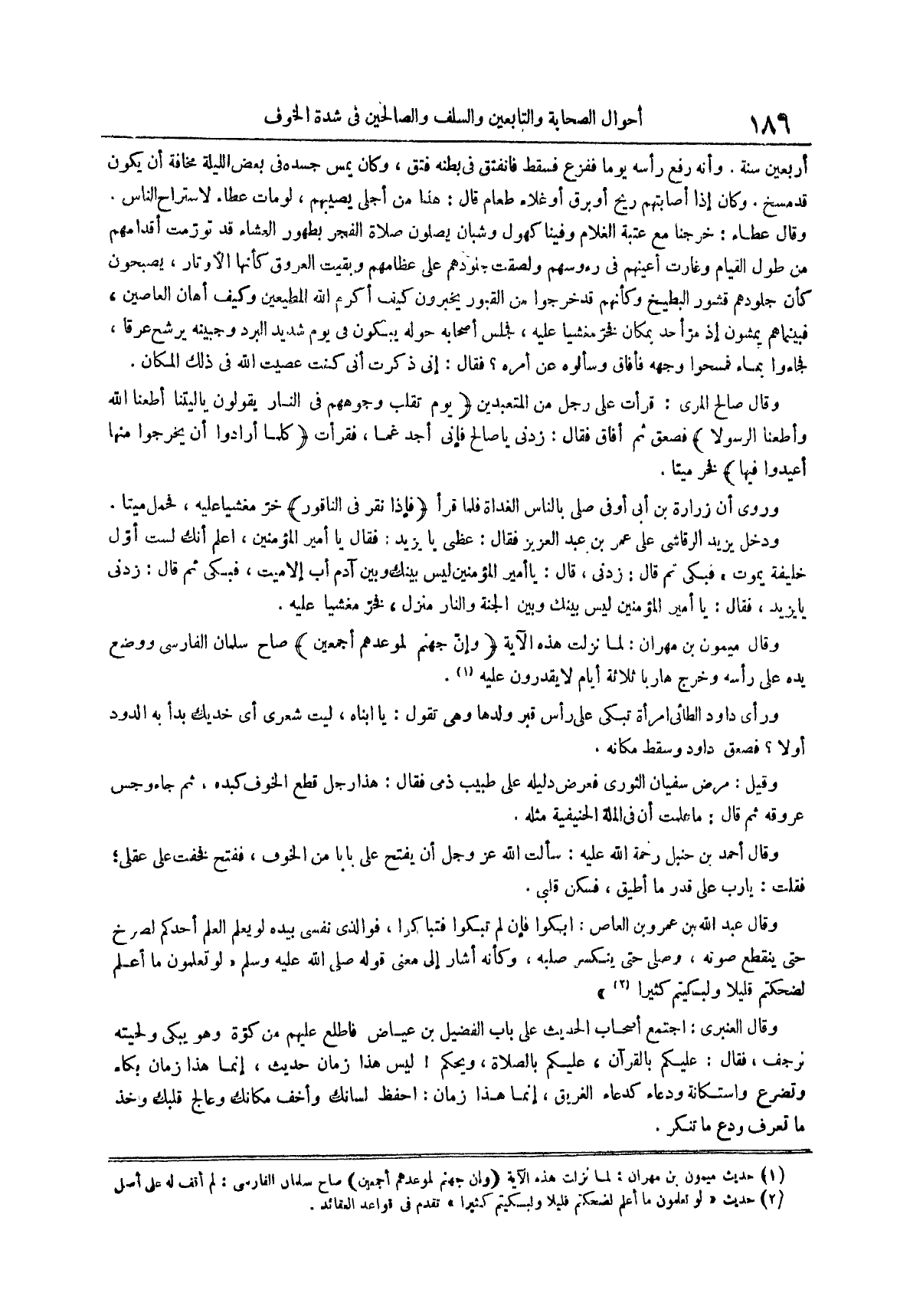 وقال عطاء خرجنا مع عتبة الغلام وفينا كهول وشبان يصلون صلاة الفجر بطهور العشاء قد تورمت أقدامهم من طول القيام وغارت أعينهم في رءوسهم ولصقت جلودهم على عظامهم وبقيت العروق كأنها الأوتار يصبحون كأن جلودهم قشور البطيخ وكأنهم قد خرجوا من القبور يخبرون كيف أكرم الله المطيعين وكيف أهان العاصين فبينما هم يمشون إذ مر أحد بمكان فخر مغشيا عليه فجلس أصحابه حوله يبكون في يوم شديد البرد وجبينه يرشح عرقا فجاءوا بماء فمسحوا وجهه فأفاق وسألوه عن أمره فقال إني ذكرت أني كنت عصيت الله في ذلك المكان