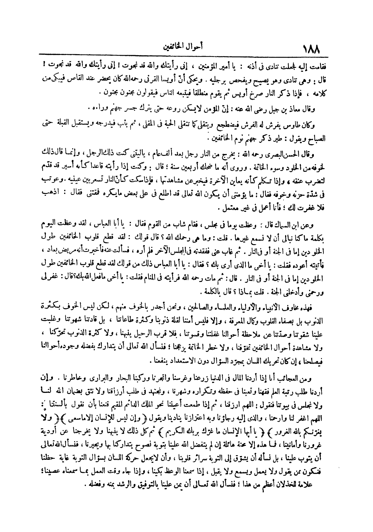 وقال الحسن البصري رحمه الله يخرج من النار رجل بعد ألف عام يا ليتني كنت ذلك الرجل وإنما قال ذلك لخوفه من الخلود وسوء الخاتمة