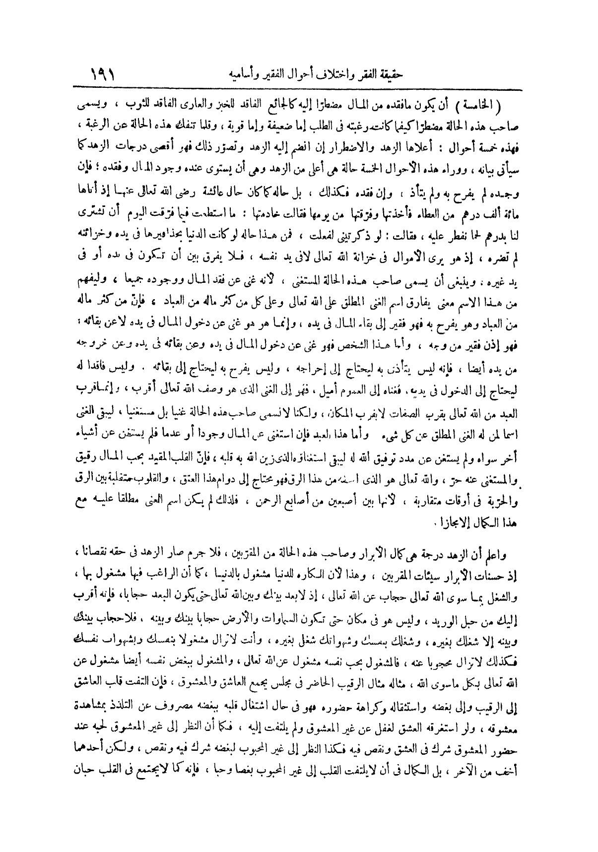 الخامسة أن يكون ما فقده من المال مضطراً إليه كالجائع الفاقد للخبز والعاري الفاقد للثوب ويسمى صاحب هذه الحالة مضطراً كيفما كانت رغبته في الطلب إما ضعيفة وإما قوية وقلما تنفك هذه الحالة عن الرغبة فهذه خمسة أحوال أعلاها الزهد والاضطرار إن انضم إليه الزهد وتصور ذلك فهو أقصى درجات الزهد كما سيأتي بيانه ووراء هذه الأحوال الخمسة حالة هي أعلى من الزهد وهي أن يستوي عنده وجود المال وفقده فإن وجده لم يفرح به ولم يتأذ وإن فقده فكذلك بل حاله كما كان حال عائشة رضي الله تعالى عنها إذا أتاها مائة ألف درهم من العطاء فأخذتها وفرقتها من يومها فقالت خادمتها ما استطعت فيما فرقت اليوم أن تشتري لنا بدرهم لحماً نفطر عليه فقالت لو ذكرتيني لفعلت فمن هذا حاله لو كانت الدنيا بحذافيرها في يده وخزائنه لم تضره إذ هو يرى الأموال في خزانة الله تعالى لا في يد نفسه فلا يفرق بين أن تكون في يده أو في يده غيره وينبغي أن يسمى صاحب هذه الحالة المستغني لأنه غني عن فقد المال ووجوده جميعاً وليفهم من هذا الاسم معنى يفارق اسم الغني المطلق على الله تعالى وعلى كل من كثر ماله من العباد فإن من كثر ماله من العباد وهو يفرح به فهو فقير إلى بقاء المال في يده وإنما هو هو غني عن دخول المال في يده لا عن بقائه فهو إذن فقير من وجه وأما هذا الشخص فهو غني عن دخول المال في يده وعن بقائه في يده وعن خروجه من يده أيضاً فإنه ليس يتأذن به ليحتاج إلى إخراجه وليس يفرح به ليحتاج إلى بقائه