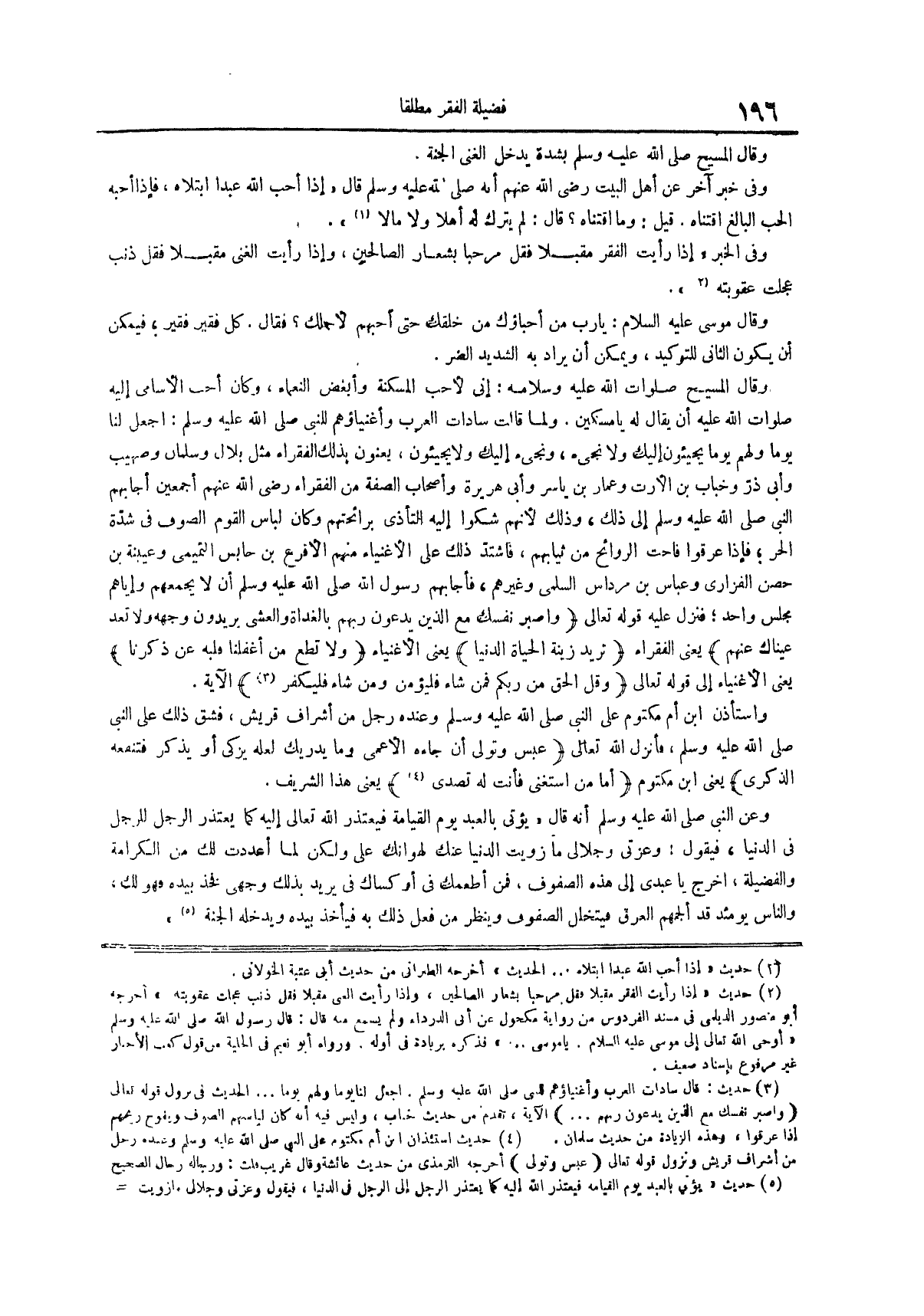 وعن النَّبِيِّ صَلَّى اللَّهُ عَلَيْهِ وَسَلَّمَ أَنَّهُ قَالَ يؤتى بالعبد يوم القيامة فيعتذر الله تعالى إليه كما يعتذر الرجل للرجل في الدنيا فيقول وعزتي وجلالي ما زويت الدنيا عنك لهوانك علي ولكن لما أعددت لك من الكرامة والفضيلة اخرج يا عبدي إلى هذه الصفوف فمن أطعمك فيّ أو كساك فيّ يريد بذلك وجهي فخذ بيده فهو لك والناس يومئذ قد ألجمهم العرق فيتخلل الصفوف وينظر من فعل ذلك به فيأخذ بيده ويدخله الجنة // حديث يؤتى بالعبد يوم القيامة فيعتذر الله إليه كما يعتذر الرجل إلى الرجل في الدنيا فيقول وعزتي وجلالي ما زويت عنك الدنيا لهرناك على الحديث أخرجه أبو الشيخ في كتاب الثواب من حديث أنس بإسناد ضعيف يقول الله عز وجل يوم القيامة أدنوا منى أحبائي فتقول الملائكة ومن أحباؤك فيقول فقراء المسلمين فيدنون منه فيقول أما إني لم أزو الدنيا عنكم لهوان كان بكم علي ولاكن أردت بذلك أن أضعف لكم كرامتي اليوم فتمنوا على ماشئتم اليوم الحديث دون آخر الحديث وأما أول الحديث فرواه أبو نعيم في الحلية وسيأتي في الحديث الذي بعده