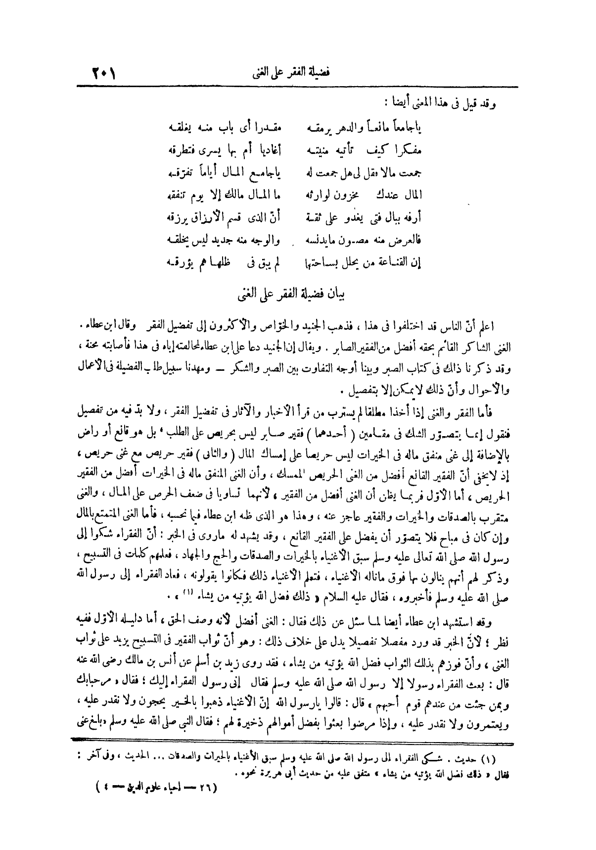 فأما الفقر والغنى إذا أخذا مطلقاً لم يسترب من قرأ الأخبار والآثار في تفضيل الفقر ولا بد فيه من تفصيل فنقول إنما يتصور الشك في مقامين {أحدهما} فقير صابر ليس بحريص على الطلب بل هو قانع أو راض بالإضافة إلى غني منفق ماله في الخيرات ليس حريصاً على إمساك المال والثاني فقير حريص مع غني حريص إذ لا يخفى أن الفقير القانع أفضل من الغني الحريص الممسك وأن الغني المنفق ماله في الخيرات أفضل من الفقير الحريص أما الأول فربما يظن أن الغني أفضل من الفقير لأنهما تساويا في ضعف الحرص على المال والغني متقرب بالصدقات والخيرات والفقير عاجز عنه وهذا هو الذي ظنه ابن عطاء فيما نحسبه فأما الغني المتمتع بالمال وإن كان في مباح فلا يتصور أن يفضل على الفقير القانع وقد يشهد له ما روي في الخبر أن الفقراء شكوا إِلَى رَسُولِ اللَّهِ صَلَّى اللَّهُ عَلَيْهِ وَسَلَّمَ سبق الأغنياء بالخيرات والصدقات والحج والجهاد فعلمهم كلمات في التسبيح وذكر لهم أنهم ينالون بها فوق ما ناله الأغنياء فتعلم الأغنياء ذلك فكانوا يقولونه فعاد الفقراء إِلَى رَسُولِ اللَّهِ صَلَّى اللَّهُ عَلَيْهِ وَسَلَّمَ فأخبروه فقال صلى الله عليه وسلم ذلك فضل الله يؤتيه من يشاء (¬1)