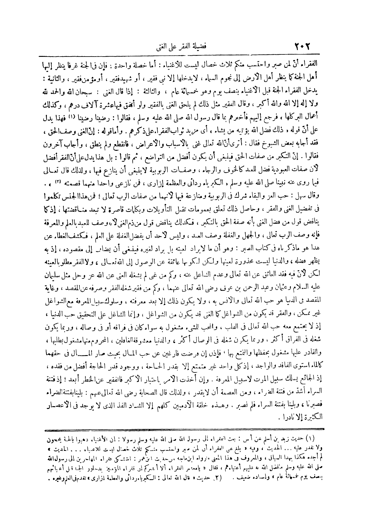 وقال سهل حب العز والبقاء شرك في الربوبية ومنازعة فيها لأنهما من صفات الرب تعالى فمن هذا الجنس تكلموا في تفضيل الغنى والفقر وحاصل ذلك تعلق بعمومات تقبل التأويلات وبكلمات قاصرة لا تبعد مناقضتها إذ كما يناقض قول من فضل الغني بأنه صفة الحق بالتكبر فكذلك يناقض قول من ذم الغني لأنه وصف للعبد بالعلم والمعرفة فإنه وصف الرب تعالى والجهل والغفلة وصف العبد وليس لأحد أن يفضل الغفلة على العلم فكشف الغطاء عن هذا هو ما ذكرناه في كتاب الصبر وهو أن ما لا يراد لعينه بل يراد لغيره فينبغي أن يضاف إلى مقصوده إذ به يظهر فضله والدنيا ليست محذورة لعينها ولكن لكونها عائقة عن الوصول إلى الله تعالى ولا الفقر مطلوباً لعينه لكن لأن فيه فقد العائق عن الله تعالى وعدم الشاغل عنه وكم من غني لم يشغله الغني عن الله عز وجل مثل سليمان عليه السلام وعثمان وعبد الرحمن بن عوف رضي الله تعالى عنهما وكم من فقير شغله الفقر وصرفه عن المقصد وغاية المقصد في الدنيا هو حب الله تعالى والأنس به ولا يكون ذلك إلا بعد معرفته وسلوك سبيل المعرفة مع الشواغل غير ممكن والفقر قد يكون من الشواغل كما الغنى قد يكون من الشواغل وإنما الشاغل على التحقيق حب الدنيا إذ لا يجتمع معه حب الله تعالى في القلب والمحب للشيء مشغول به سواء كان في فراقه أو في وصاله وربما يكون شغله في الفراق أكثر وربما يكون شغله في الوصال أكثر والدنيا معشوقة الغافلين المحروم منها مشغول بطلبها والقادر عليها مشغول بحفظها والتمتع بها فإذن إن فرضت فارغين عن حب المال بحيث صار المال في حقهما كالماء استوى الفاقد والواجد إذ كل واحد غير متمتع إلا بقدر الحاجة ووجود قدر الحاجة أفضل من فقده إذ الجائع يسلك سبيل الموت لا سبيل المعرفة وإن أخذت الأمر باعتبار الأكبر فالفقير عن الخطر أبعد إذ فتنة السراء أشد من فتنة الضراء ومن العصمة أن لا يقدر ولذلك قال الصحابة رضي الله تعالى عنهم بلينا بفتنة الضراء فصبرنا وبلينا بفتنة السراء فلم نصبر وهذه خلقة الآدميين كلهم إلا الشاذ الفذ الذي لا يوجد في الأعصار الكثيرة إلا نادرا